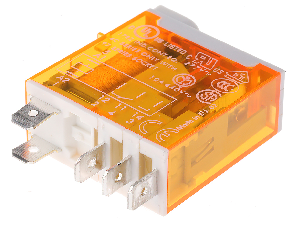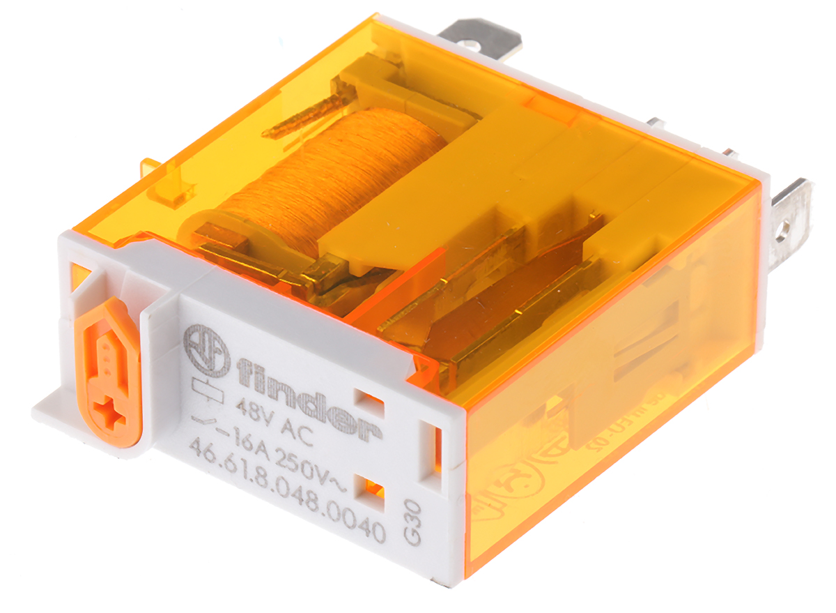 This is 48V ac Coil Non-Latching Relay SPDT 25A Switching Current Plug In Single Pole manufactured by Finder. The manufacturer part number is 46.61.8.048.0040. The coil voltage of the product is 48v ac. Applications Information involves general purpose. The terminal is a quick connect type. It holds up to 1350ω coil resistance. It is capable of doing 100000 cycles in a lifetime . The product complies with all safety standards, such as ce, eac. Robust coil power of 1.2w. The product has 6kv isolation coil to contact. It has a maximum operating temperature of +70°c. It is integrated with 25a switching current. Latching Options - no. The contact is equipped with spdt configuration. The product comes in 12.4mm depth. The product is available in plug in configuration. The product 46, is a highly preferred choice for users. Its accurate length is 29mm. In addition, the height is 32.8mm. It has a maximum AC switching voltage of 440v ac. Whereas, the minimum operating temperature of the product is -40°c. It also features an AC switching power of 4 kva. It has equipped with 1 poles. The product is made from sturdy silver alloy materials.