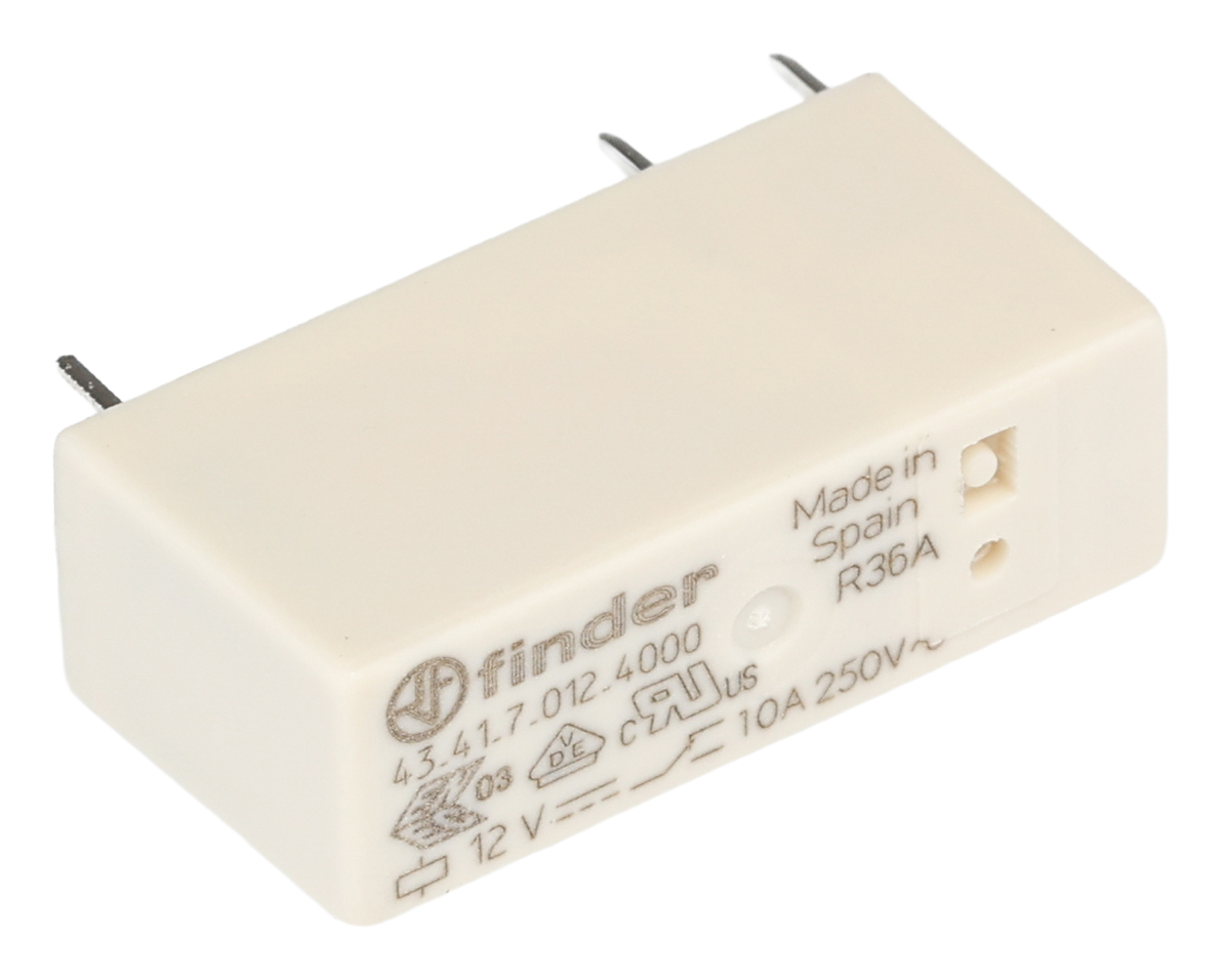 This is PCB Mount Plug In Relay 12V dc Coil 10A Switching Current SPDT manufactured by Finder. The manufacturer part number is 434170124000. It is capable of doing 100000 cycles in a lifetime . While it carries 48v dc of maximum DC switching voltage. The product complies with all safety standards, such as curus, eac. The product is available in pcb mount configuration. Robust coil power of 250mw. The product 43, is a highly preferred choice for users. It is integrated with 10a switching current. The coil voltage of the product is 12v dc. It consists of single coils. The contact is equipped with spdt configuration. It has a maximum AC switching voltage of 400v ac. Whereas, the minimum operating temperature of the product is -40°c. The product has 6kv isolation coil to contact. It has a maximum 15 a switching current AC . It has equipped with 1 poles. It has a maximum operating temperature of +85°c. The product is made from sturdy silver alloy materials.