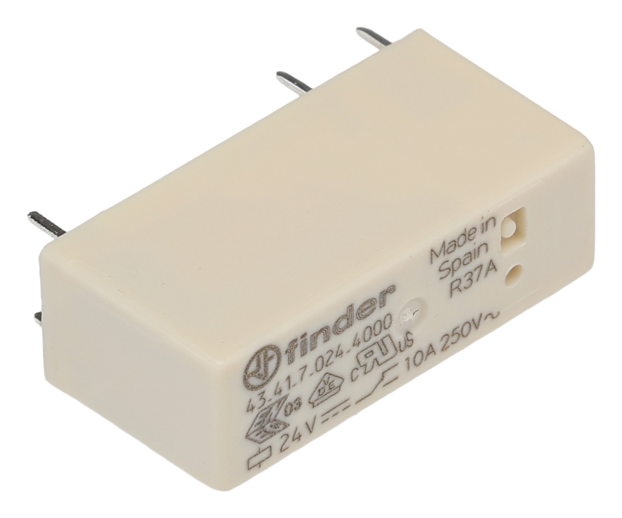 This is PCB Mount Plug In Relay 24V dc Coil 10A Switching Current SPDT manufactured by Finder. The manufacturer part number is 434170244000. The product is available in pcb mount configuration. It is integrated with 10a switching current. The coil voltage of the product is 24v dc. The contact is equipped with spdt configuration. It has equipped with 1 poles.