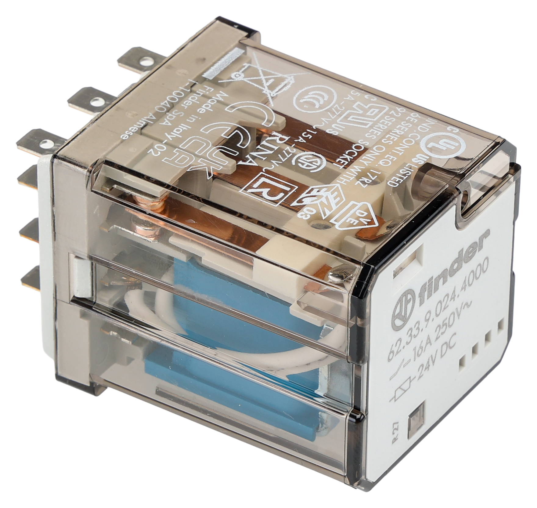 This is Plug In Relay 24V dc Coil 16A Switching Current 3CO 3PDT manufactured by Finder. The manufacturer part number is 623390244000. The product is available in plug in configuration. It is integrated with 16a switching current. The coil voltage of the product is 24v dc. The contact is equipped with 3pdt configuration. It has equipped with 3 poles.