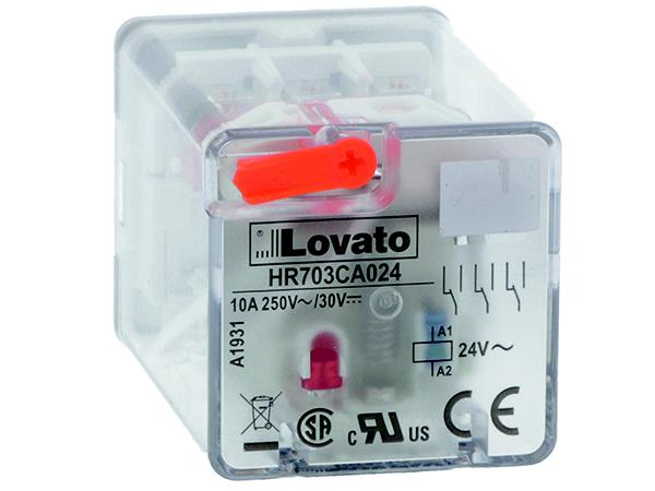 This is DIN Rail Non-Latching Relay 230V ac Coil 10A Switching Current 3CO manufactured by Lovato. The manufacturer part number is HR703CA230. The product is available in din rail configuration. It is integrated with 10a switching current. The coil voltage of the product is 230v ac. The contact is equipped with 3pdt configuration. It has equipped with 3 poles.