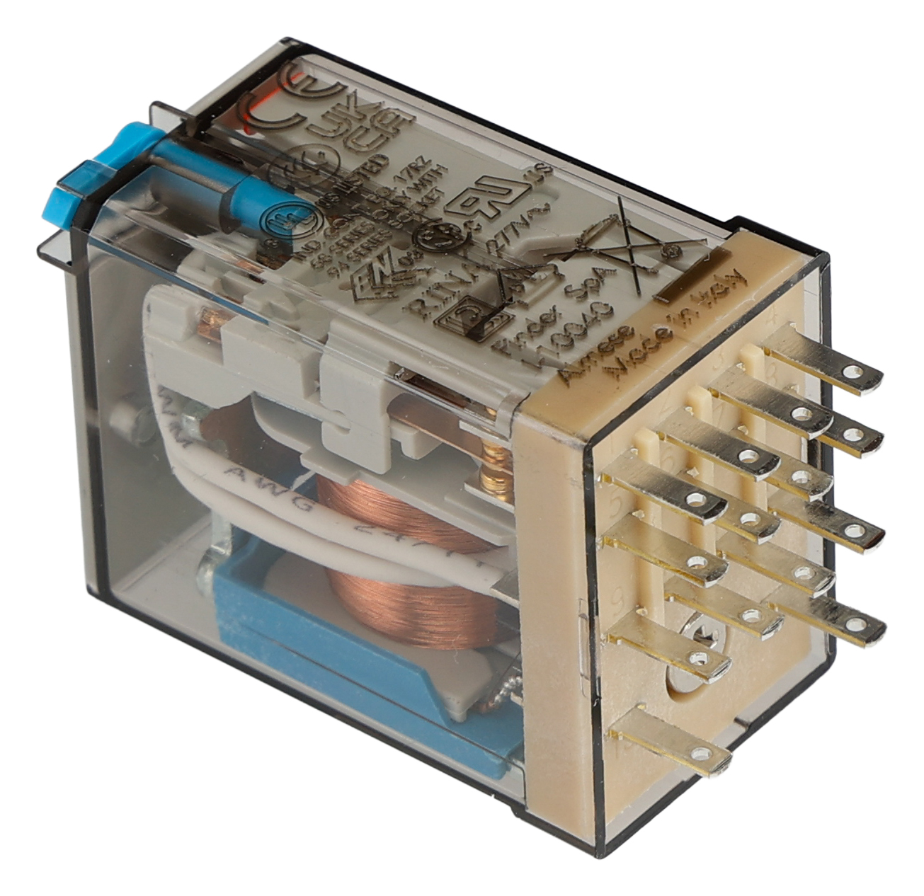 This is Plug In Relay 24V dc Coil 7A Switching Current manufactured by Finder. The manufacturer part number is 553490245040. It is capable of doing 150000 cycles in a lifetime . While it carries 220v dc of maximum DC switching voltage. The product complies with all safety standards, such as curus, eac. The product is available in plug in configuration. Robust coil power of 1.5w. The product 55, is a highly preferred choice for users. Latching Options - no. The coil voltage of the product is 24v dc. It consists of single coils. The contact is equipped with 4pdt configuration. It is integrated with 7a switching current. Whereas, the minimum operating temperature of the product is -40°c. It has a maximum operating temperature of +85°c. It has a maximum AC switching voltage of 250v ac. The product has 4kv isolation coil to contact. It has a maximum 15 a switching current AC . It has equipped with 4 poles. The terminal is a plug in type. The product is made from sturdy agni + au materials.