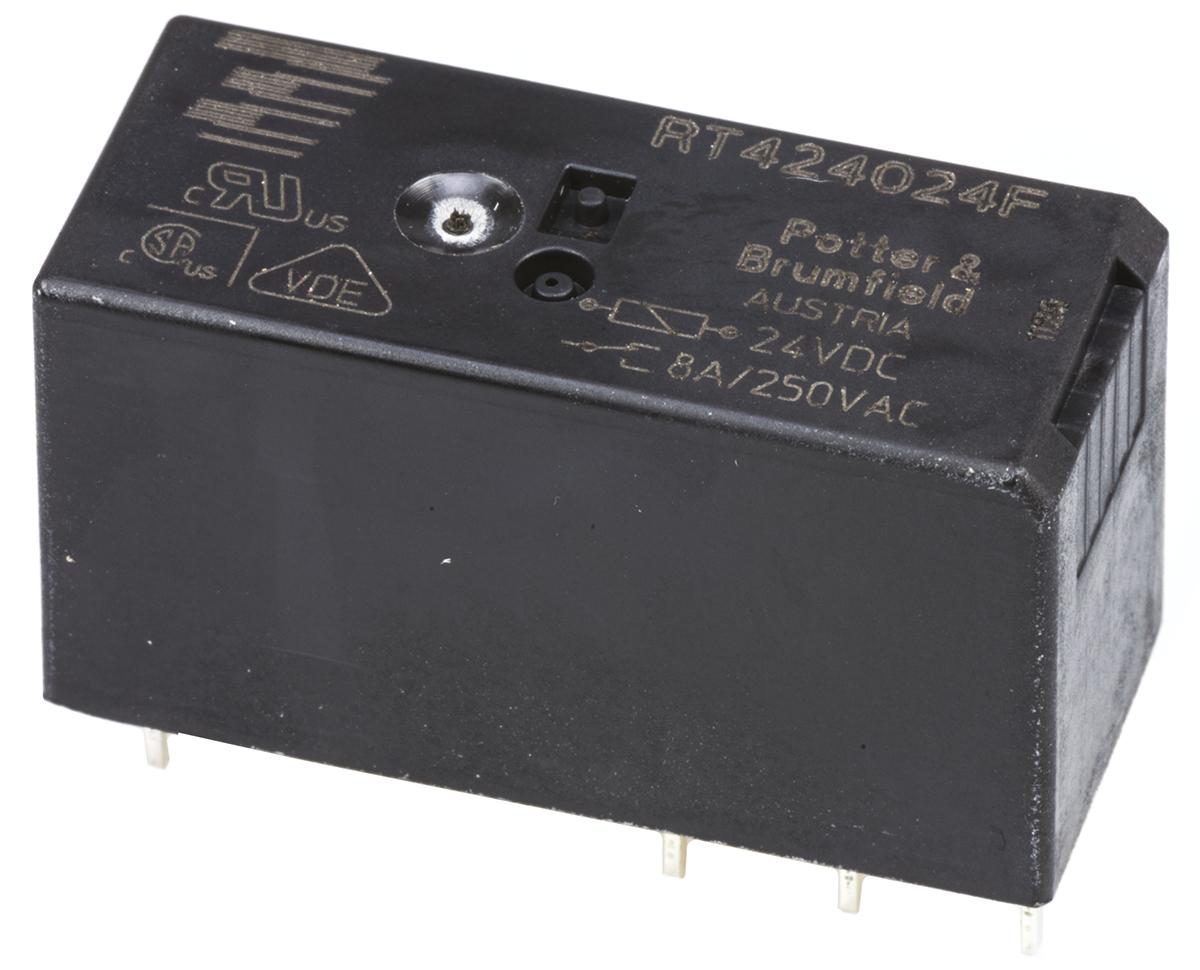 This is PCB Mount Non-Latching Relay 24V dc Coil 8A Switching Current DPDT manufactured by TE Connectivity. The manufacturer part number is RT424024F. While it carries 30v dc of maximum DC switching voltage. The product is available in pcb mount configuration. Robust coil power of 400mw. It is integrated with 8a switching current. The coil voltage of the product is 24v dc. Its accurate length is 29mm. In addition, the height is 15.7mm. Applications Information involves power. The product comes in 12.7mm depth. It has a maximum AC switching voltage of 277v ac. Whereas, the minimum operating temperature of the product is -40°c. The product has 5kv ac isolation coil to contact. The contact is equipped with dpdt configuration. The terminal is a through hole type. The product is made from sturdy silver alloy materials. It has a maximum operating temperature of +85°c. It holds up to 1.44 kω coil resistance.