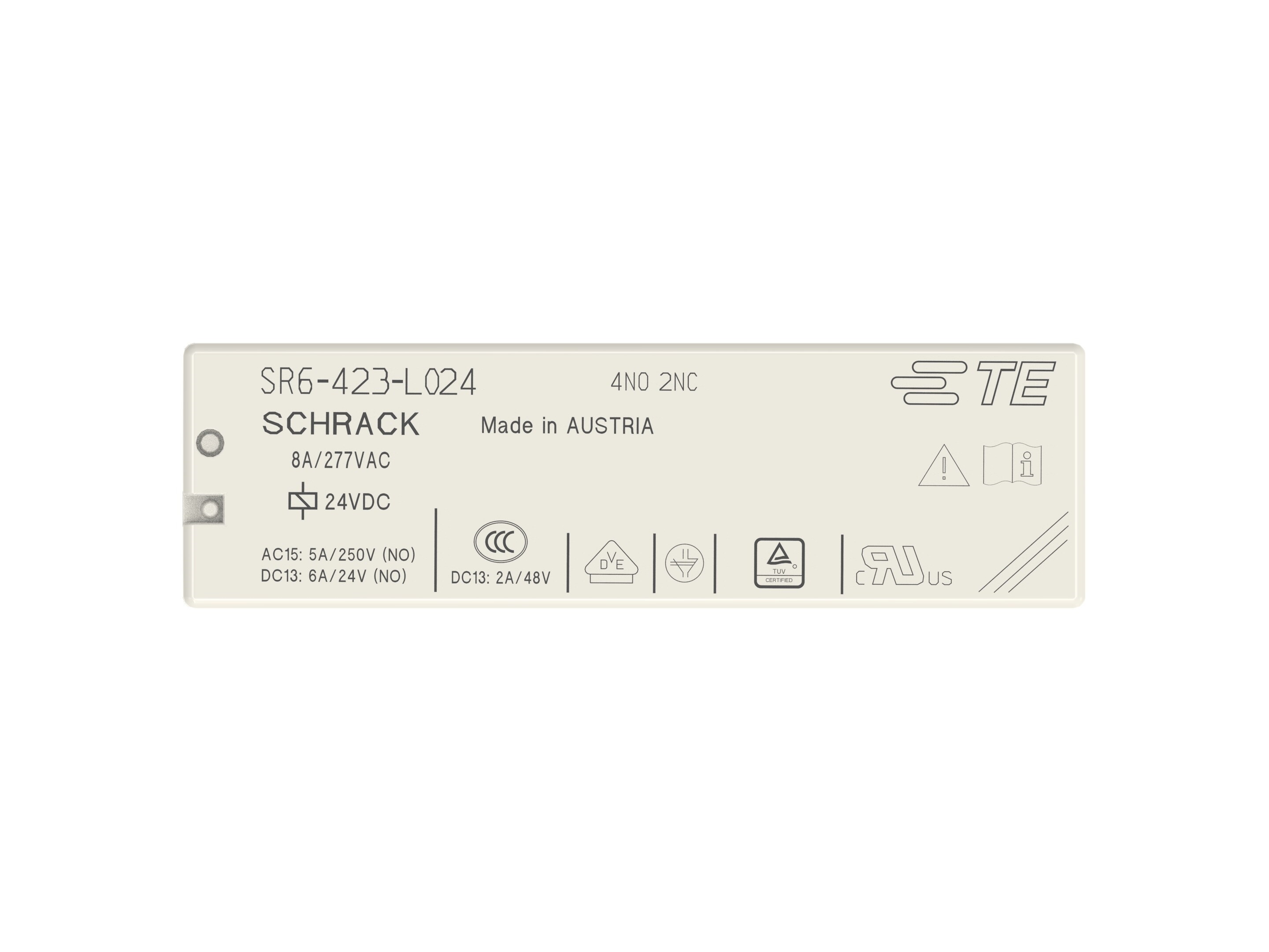 This is PCB Mount Force Guided Relay 24V dc Coil 8A Switching Current 4NO/2NC manufactured by TE Connectivity. The manufacturer part number is 1558737-8. It has a maximum operating temperature of +85°c. The given dimensions of the product include 55 x 16.5 x 15.5mm. The product is available in pcb mount configuration. Robust coil power of 700mw. The product schrack sr6, is a highly preferred choice for users. It is integrated with 8a switching current. The coil voltage of the product is 24v dc. In addition, the height is 15.7mm. Furthermore, the product is 16.5mm wide. Its accurate length is 55mm. It has a maximum AC switching voltage of 400v ac. Whereas, the minimum operating temperature of the product is -40°c. The product is made from sturdy silver alloy materials. It has equipped with 6 poles. The terminal is a through hole type. The contact is equipped with 4no/2nc configuration. It holds up to 822 ω coil resistance.