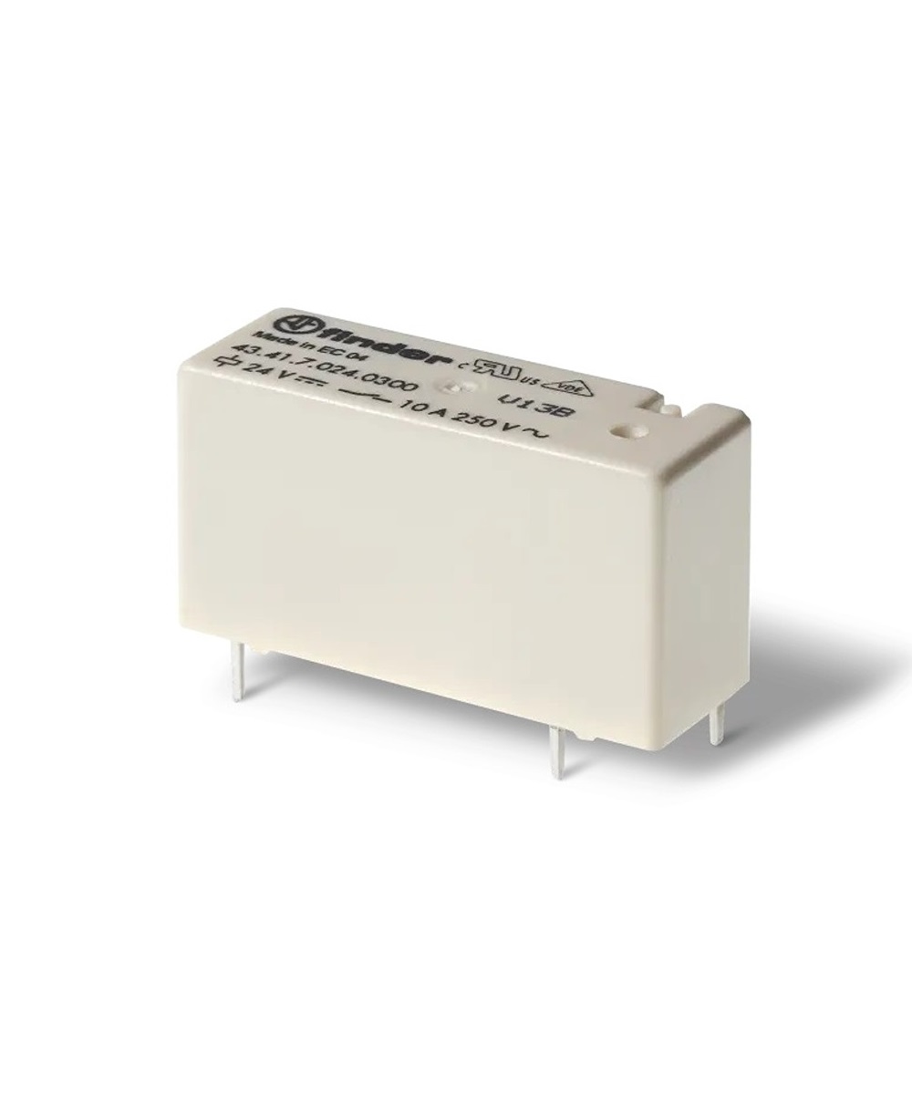 This is PCB Mount Power Relay 24V dc Coil 10A Switching Current SPDT manufactured by Finder. The manufacturer part number is 434170244001. It is capable of doing 100000 cycles in a lifetime . While it carries 48v dc of maximum DC switching voltage. The product complies with all safety standards, such as curus, eac. The product is available in pcb mount configuration. Robust coil power of 250mw. The product 43, is a highly preferred choice for users. It is integrated with 10a switching current. The coil voltage of the product is 24v dc. It consists of single coils. The contact is equipped with spdt configuration. It has a maximum AC switching voltage of 400v ac. Whereas, the minimum operating temperature of the product is -40°c. The product has 6kv isolation coil to contact. It has a maximum 15 a switching current AC . It has equipped with 1 poles. It has a maximum operating temperature of +85°c. The product is made from sturdy silver alloy materials.