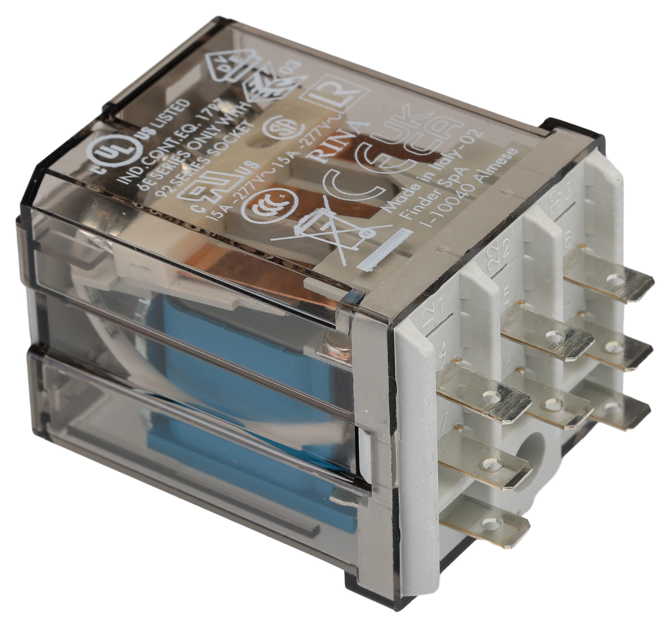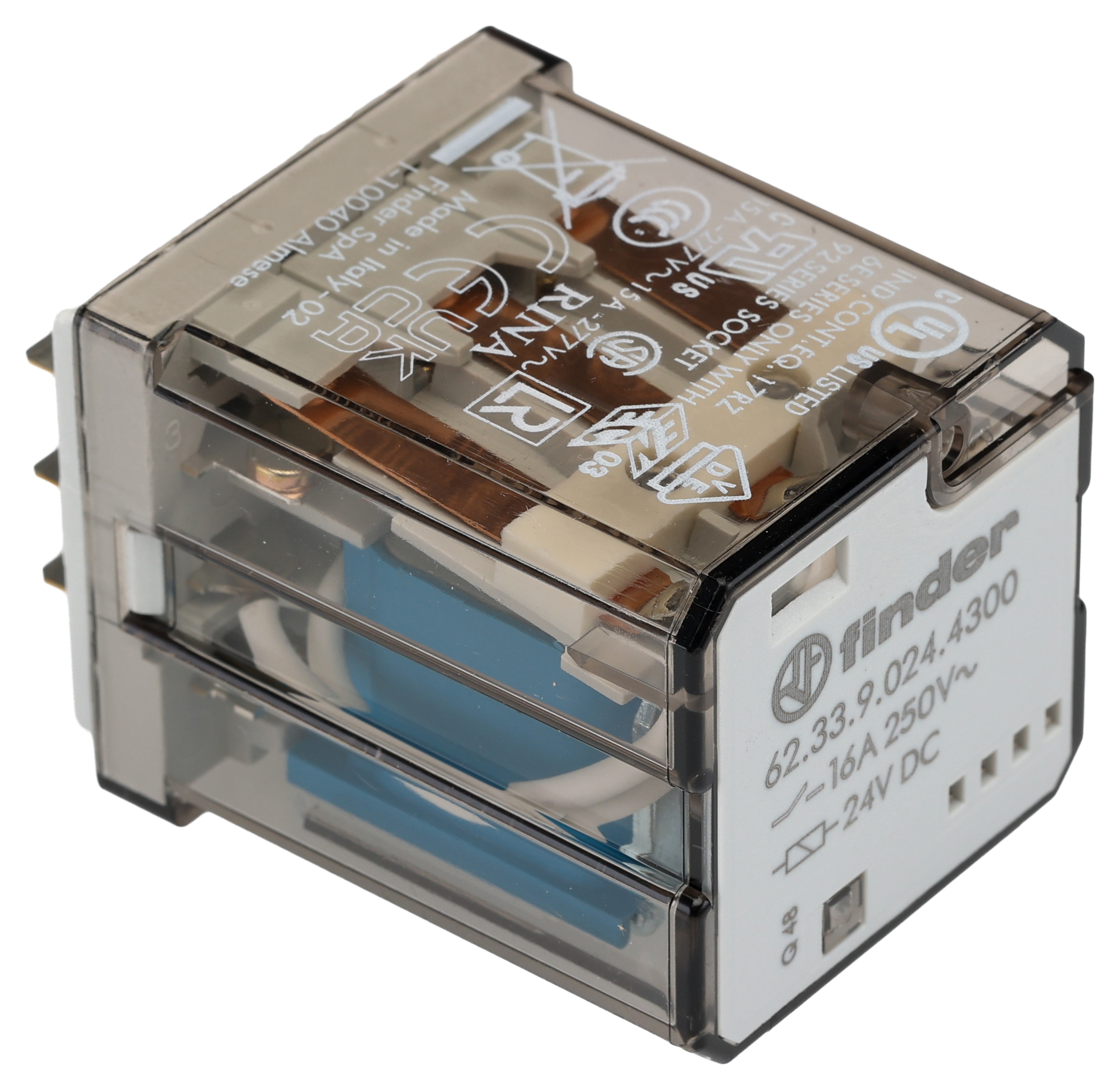 This is Plug In Power Relay 24V dc Coil 16A Switching Current 3PST manufactured by Finder. The manufacturer part number is 623390244300. It is capable of doing 100000 cycles in a lifetime . While it carries 220v dc of maximum DC switching voltage. The product complies with all safety standards, such as curus, eac. The product is available in plug in configuration. Robust coil power of 3w. The product 62, is a highly preferred choice for users. It is integrated with 16a switching current. The coil voltage of the product is 24v dc. It consists of single coils. The contact is equipped with 3pst configuration. Whereas, the minimum operating temperature of the product is -40°c. It has a maximum operating temperature of +50°c. It has a maximum AC switching voltage of 400v ac. The product has 6kv isolation coil to contact. It has a maximum 120 a switching current AC . It has equipped with 3 poles. The terminal is a plug in type. The product is made from sturdy silver alloy materials.