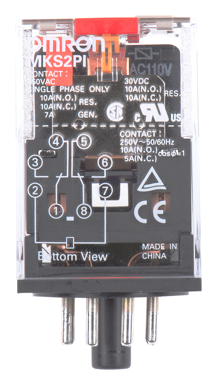 This is Plug In Relay 110V ac Coil 10A Switching Current DPDT manufactured by Omron. The manufacturer part number is MKS2PI 110VAC. The coil voltage of the product is 110v ac. Applications Information involves general purpose. The terminal is a plug in type. It holds up to 932ω coil resistance. While it carries 250v dc of maximum DC switching voltage. It bears a maximum 300 w of DC switching power. It has a maximum operating temperature of +60°c. It is integrated with 10a switching current. Latching Options - no. The contact is equipped with dpdt configuration. Its accurate length is 34.5mm. The product is available in plug in configuration. The product mks2, is a highly preferred choice for users. The product comes in 34.5mm depth. In addition, the height is 53.3mm. It has a maximum AC switching voltage of 250v ac. Whereas, the minimum operating temperature of the product is -40°c. It also features an AC switching power of 2.5 kva. It has equipped with 2 poles. The product is made from sturdy silver alloy materials.