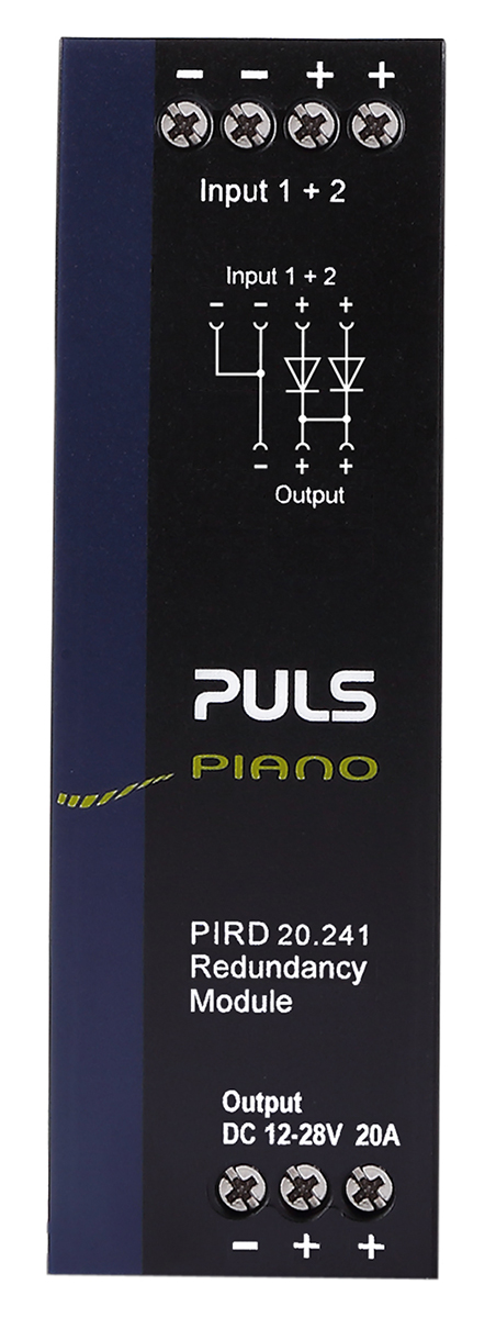This is Redundancy module for use with Power Supplies Screw manufactured by PULS. The manufacturer part number is PIRD20.241. The product complies with all safety standards, such as en 55011, en 55022, en 61000-6-1, en 61000-6-2, iec/cispr 16-1-2, iec/cispr 16-2-1, ul 508, ul 60950-1. It is a type of dual input redundancy module accessory. 12 → 28 (input 1) v dc, 9 → 35 (input 2) v dc is the Rated Input Voltage of the product . The product is available in din rail mount style. Moreover, it has 0 → 10 (<+55 °c) a, 0 → 6.25 (<+70 °c) a input current range . Features 12 → 24v dc supply voltage. The product is highly suitable for power supplies. It provides robust protection features, such as input transient protection, output transient protection, reverse input polarity protection, surge protection. The terminal is a screw type.