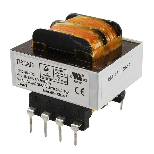 This is manufactured by Triad Magnetics. The manufacturer part number is FS10-250-C2. As well as [Secondary Wing(s)]. It is assigned with possible HTSUS value of 8504.31.4035. The product is rohs3 compliant. Moreover, it has pc pin terminal style. The maximum product's output current is parallel 500ma, series 250ma. Features primary voltage 115v, 230v. It has the maximum seated height of 30.15mm. It comes in laminated core configuration. Features dual. In addition, it is reach unaffected. Center Tap - no. The triad magnetics's product offers user-desired applications. Full load voltage - secondary includes parallel 5v, series 10v. The product's diameters include 34.93mm l x 28.58mm w. It has a long 23 weeks standard lead time. 4200vrms of isolation voltage. Its typical moisture sensitivity level is not applicable. The product is available in through hole configuration. The typical product's weight is 0.25 lb (113.4 g). The product split pack™, class 2/3, fs, is a highly preferred choice for users. In addition, tube is the available packaging type of the product. The maximum power of the product is 2.4va. The product is designated with the ear99 code number.