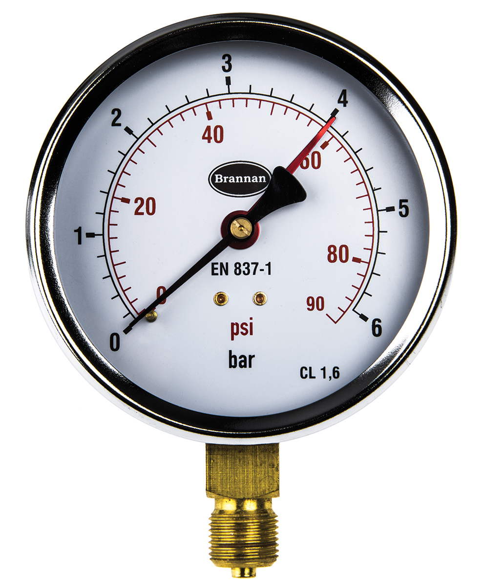 This is Analogue Positive Pressure Gauge Bottom Entry 6bar Connection Size BSP 3/8 manufactured by Brannan. The manufacturer part number is 34/654/0. It features a remarkable analogue display. The product is available in bottom entry configuration. Moreover, its gauge outside diameter is approximately 100mm . Moreover, it has a maximum 6bar pressure measurement . It has a standard g 3/8 size connection . The casing is constructed from highly stable steel material. Additionally, it has a minimum 0bar pressure measurement .