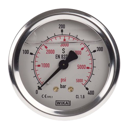 This is Analogue Positive Pressure Gauge Back Entry 400bar Connection Size G 1/4 manufactured by WIKA. The manufacturer part number is 9314203. It features a remarkable analogue display. The product is available in back entry configuration. Moreover, its gauge outside diameter is approximately 63mm . Moreover, it has a maximum 400bar pressure measurement . It has a standard g 1/4 size connection . The casing is constructed from highly stable stainless steel material. It is calibrated ukas . Whereas, the minimum operating temperature of the product is -20°c. It has a maximum operating temperature of +60°c. Additionally, it has a minimum 0bar pressure measurement .
