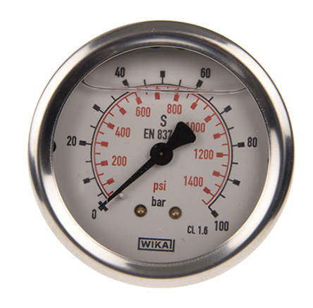 This is Analogue Positive Pressure Gauge Back Entry 100bar Connection Size G 1/4 manufactured by WIKA. The manufacturer part number is 46852703. It features a remarkable analogue display. The product is available in back entry configuration. Moreover, its gauge outside diameter is approximately 63mm . Moreover, it has a maximum 100bar pressure measurement . It has a standard g 1/4 size connection . The casing is constructed from highly stable stainless steel material. It is calibrated ukas . Whereas, the minimum operating temperature of the product is -20°c. It has a maximum operating temperature of +60°c. Additionally, it has a minimum 0bar pressure measurement .