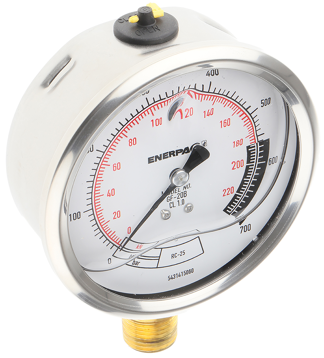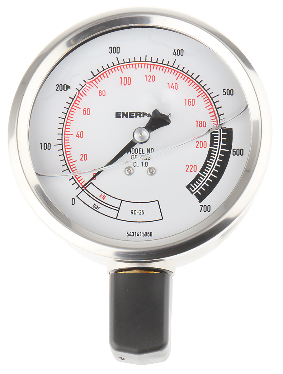 This is Hydraulic Pressure Gauge 700bar Connection Size NPT 1/2 manufactured by Enerpac. The manufacturer part number is GF20B. In addition, it is offered with ± 1% best accuracy . It features a remarkable analogue display. The product is available in bottom entry configuration. Moreover, its gauge outside diameter is approximately 100mm . Moreover, it has a maximum 700bar pressure measurement . The casing is constructed from highly stable stainless steel material. Additionally, it has a minimum 0bar pressure measurement .
