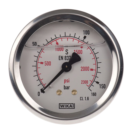 This is Analogue Positive Pressure Gauge Back Entry 160bar Connection Size G 1/4 manufactured by WIKA. The manufacturer part number is 9314200. It features a remarkable analogue display. The product is available in back entry configuration. Moreover, its gauge outside diameter is approximately 63mm . Moreover, it has a maximum 160bar pressure measurement . It has a standard g 1/4 size connection . The casing is constructed from highly stable stainless steel material. It is calibrated ukas . Whereas, the minimum operating temperature of the product is -20°c. It has a maximum operating temperature of +60°c. Additionally, it has a minimum 0bar pressure measurement .