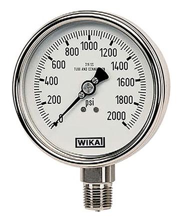 This is Wika Instruments Analogue Positive Pressure Gauge Back Entry 1500psi Connection Size 1/4 NPT manufactured by WIKA. The manufacturer part number is 9832216. In addition, it is offered with ± 2/1/2% best accuracy . Moreover, its gauge outside diameter is approximately 63mm . Moreover, it has a maximum 1500psi pressure measurement . The casing is constructed from highly stable stainless steel material. Whereas, the minimum operating temperature of the product is -20°c. It has a maximum operating temperature of +60°c. It has a pressure gauge of dial type .
