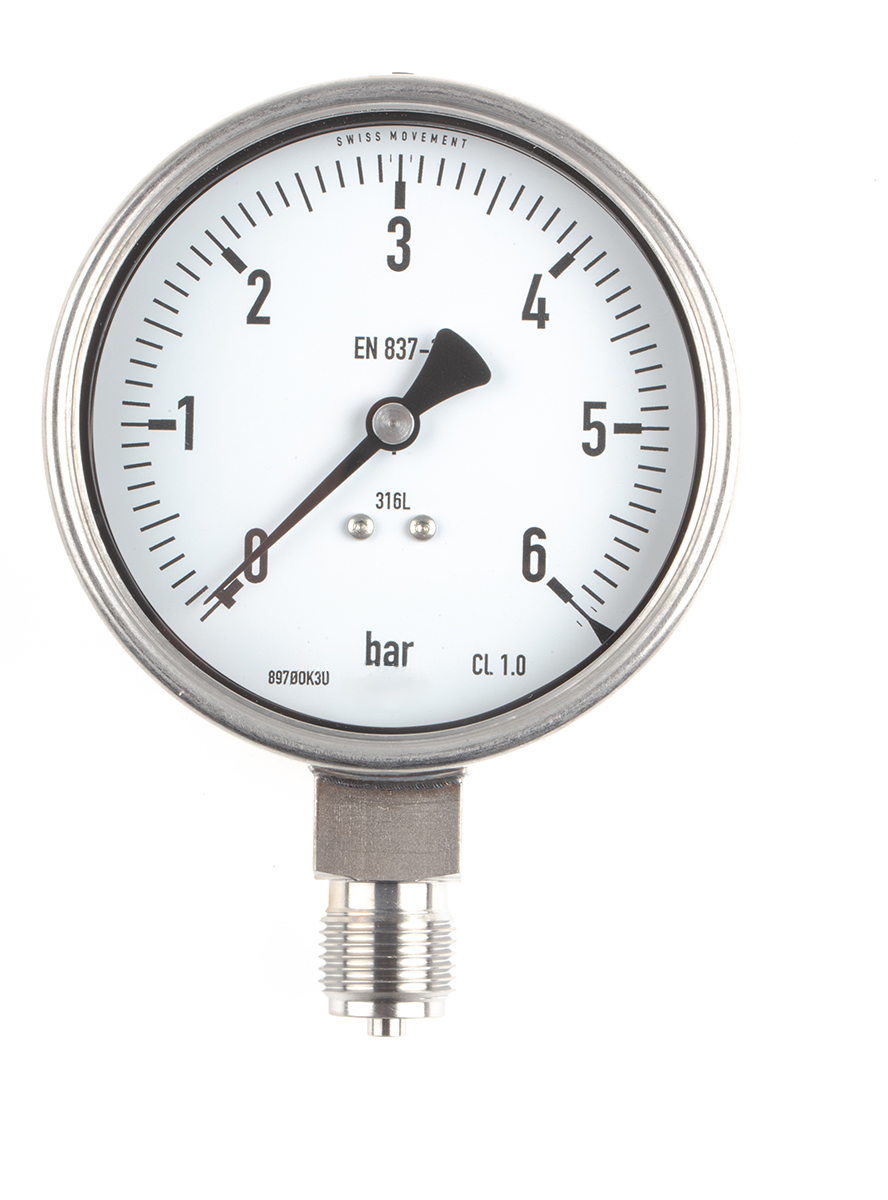 This is Analogue Pressure Gauge 6bar Bottom Entry 0bar min. manufactured by RS PRO. The manufacturer part number is 33043414. It features a remarkable analogue display. The product is available in bottom entry configuration. Moreover, its gauge outside diameter is approximately 100mm . Moreover, it has a maximum 6bar pressure measurement . The casing is constructed from highly stable stainless steel material. Whereas, the minimum operating temperature of the product is -20°c. It has a maximum operating temperature of +60°c. Additionally, it has a minimum 0bar pressure measurement .