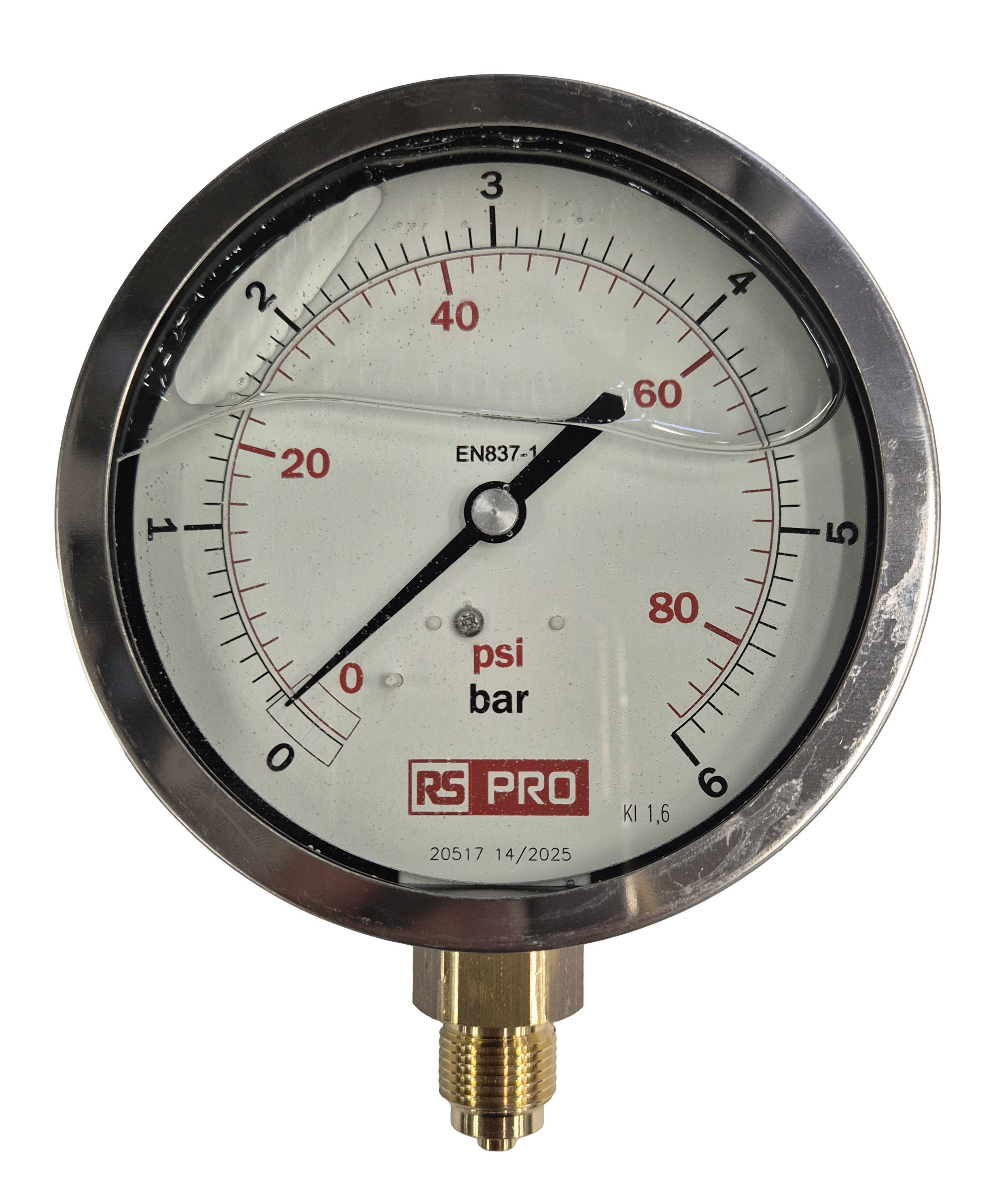 This is BSP 3/8 Analogue Pressure Gauge 6bar Bottom Entry 100mm Outside Diameter manufactured by RS PRO. The manufacturer part number is 152-288. It features a remarkable analogue display. The product is available in bottom entry configuration. Moreover, its gauge outside diameter is approximately 100mm . Moreover, it has a maximum 6bar pressure measurement . It has a standard bsp 3/8 size connection . The casing is constructed from highly stable stainless steel material. Whereas, the minimum operating temperature of the product is 0°c. It has a maximum operating temperature of +65°c. Additionally, it has a minimum 0bar pressure measurement .