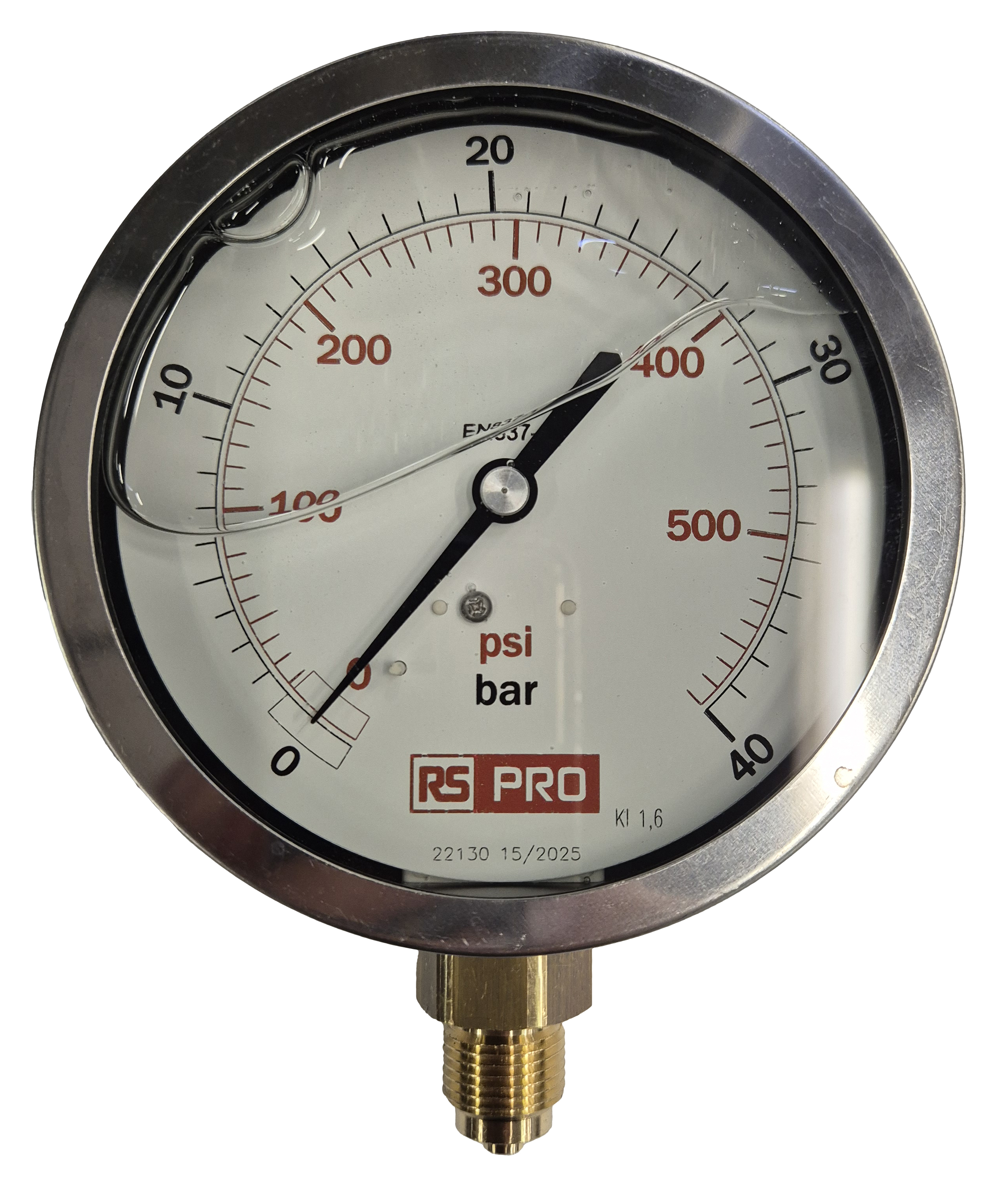 This is BSP 3/8 Analogue Pressure Gauge 40bar Bottom Entry 100mm Outside Diameter manufactured by RS PRO. The manufacturer part number is 152-292. It features a remarkable analogue display. The product is available in bottom entry configuration. Moreover, its gauge outside diameter is approximately 100mm . Moreover, it has a maximum 40bar pressure measurement . It has a standard bsp 3/8 size connection . The casing is constructed from highly stable stainless steel material. Whereas, the minimum operating temperature of the product is 0°c. It has a maximum operating temperature of +65°c. Additionally, it has a minimum 0bar pressure measurement .