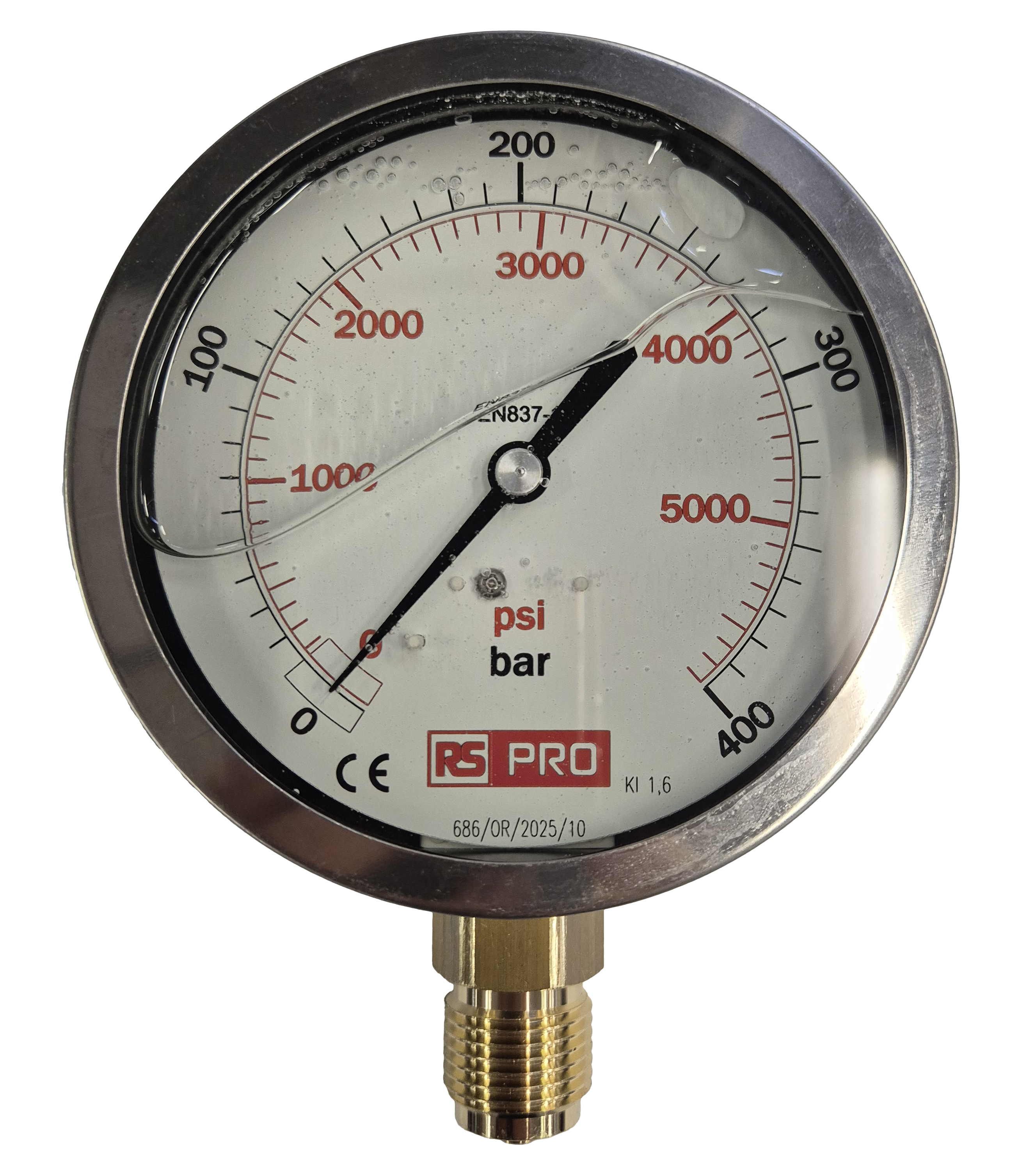 This is BSP 1/2in Analogue Pressure Gauge 400bar Bottom Entry 100mm Outside Diameter manufactured by RS PRO. The manufacturer part number is 152-297. It features a remarkable analogue display. The product is available in bottom entry configuration. Moreover, its gauge outside diameter is approximately 100mm . Moreover, it has a maximum 400bar pressure measurement . It has a standard bsp 1/2in size connection . The casing is constructed from highly stable stainless steel material. Whereas, the minimum operating temperature of the product is 0°c. It has a maximum operating temperature of +65°c. Additionally, it has a minimum 0bar pressure measurement .