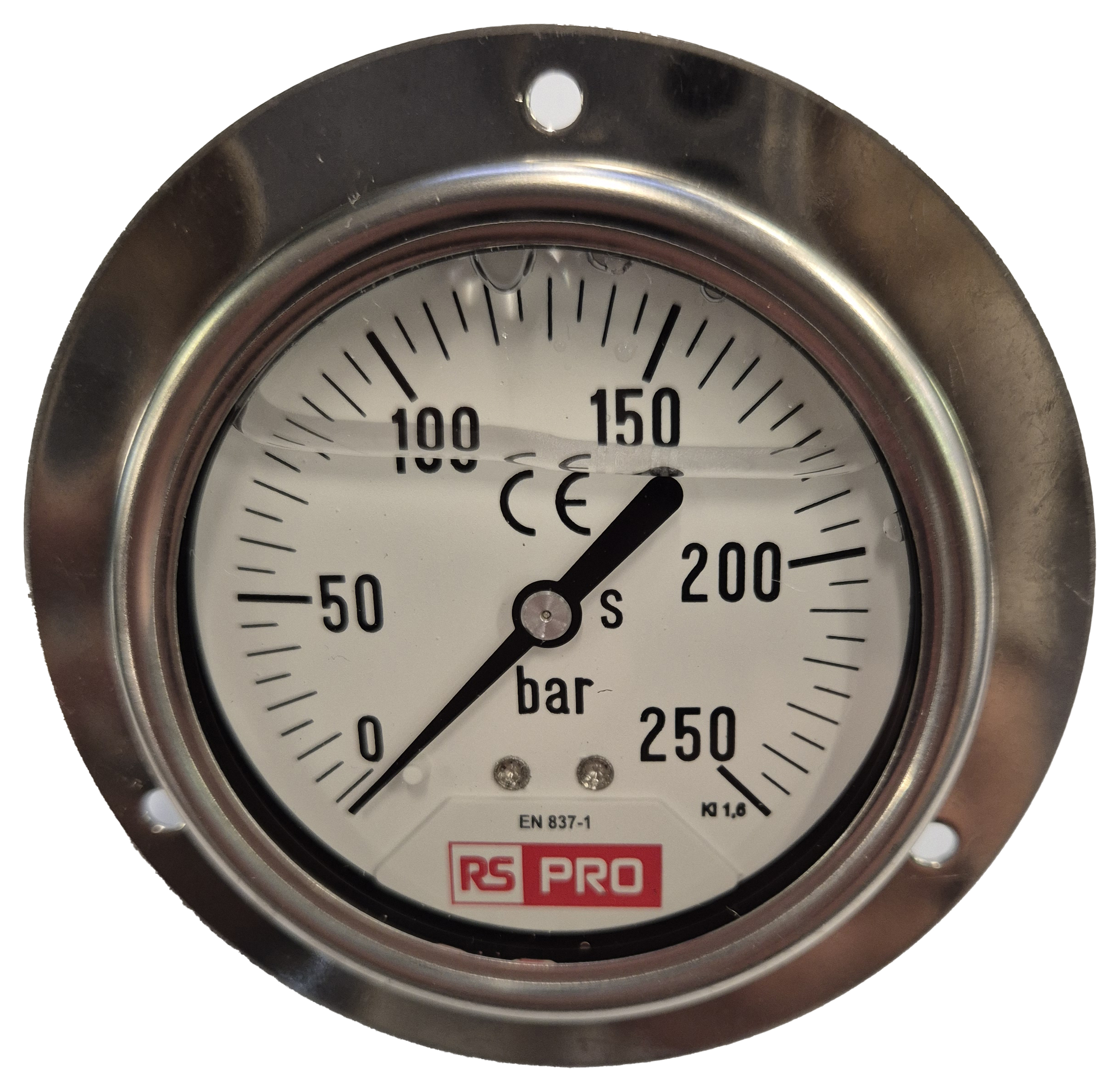 This is BSP 1/4 Analogue Pressure Gauge 250bar Bottom Entry 63mm Outside Diameter manufactured by RS PRO. The manufacturer part number is 179-992. It features a remarkable analogue display. The product is available in bottom entry configuration. Moreover, its gauge outside diameter is approximately 63mm . Moreover, it has a maximum 250bar pressure measurement . It has a standard bsp 1/4 size connection . The casing is constructed from highly stable stainless steel material. Additionally, it has a minimum 0bar pressure measurement .
