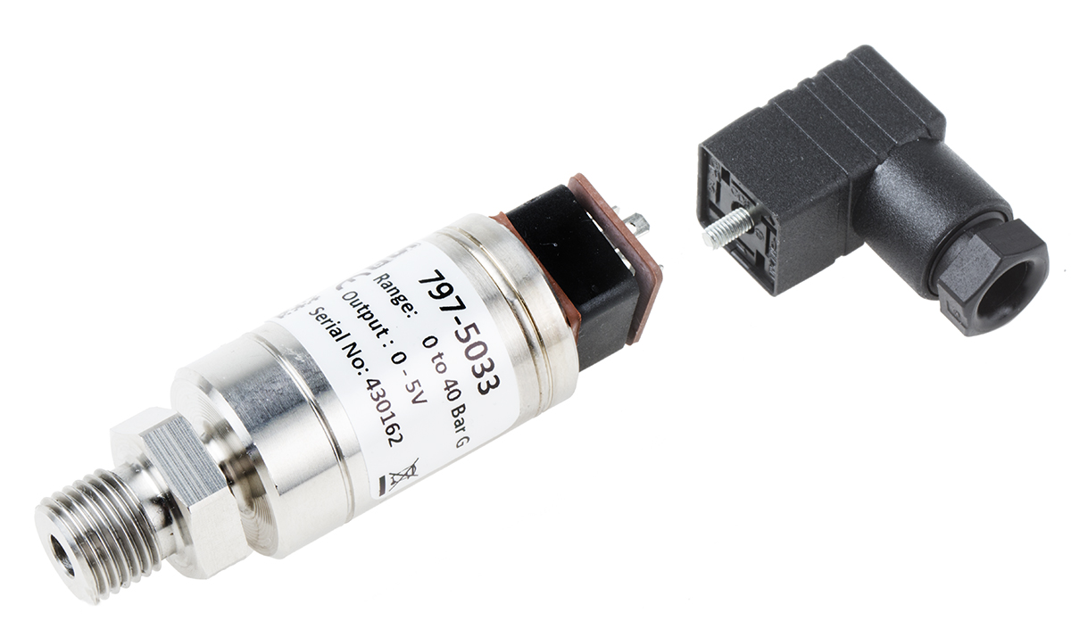 This is Gauge Pressure Sensor 40bar Max Pressure Reading 9 → 32 V dc BSP 1/4 manufactured by RS Pro. The manufacturer part number is 797-5033. The product is available in threaded configuration. It is IP rated with ip65. It has provided with din 43650 type c electrical connection. Furthermore, it has avoltage output. Whereas, its maximum pressure reading is 40bar . The product also features robust stainless steel housing material. In addition, it has a minimum 0bar pressure reading . In addition, it has a/an relative type pressure reading . Whereas, the minimum operating temperature of the product is -20°c. It includes a standard g1/4 process connection . Features 9 → 32 v dc supply voltage. It has a steady 0 → 5 v analogue output . It has a maximum operating temperature of +135°c. It is created for measuring medias like air, gas, hydraulic fluid, liquid, water . It provides high accuracy of ±0.25 %.