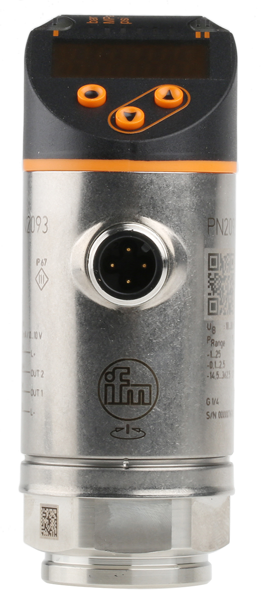 This is Relative for Fluid Pressure Sensor IO-Link 25bar Max Pressure Reading 18 → 30 V dc G1/4 manufactured by ifm electronic. The manufacturer part number is PN2093. It has provided with m12 connector electrical connection. It is tailored with io-link communication protocol . It also carries 250 ma maximum current. It is IP rated with ip65, ip67. Features 18 → 30 v dc supply voltage. Furthermore, it has aanalogue + pnp-no/nc programmable output. It has a steady 0 → 10 v, 4 → 20 ma analogue output . The product also features robust pbt gf20, pbt+pc gf30, pc, stainless steel housing material. In addition, it has a minimum -1bar pressure reading . In addition, it has a/an relative type pressure reading . It is created for measuring medias like fluid . It includes a standard g1/4 process connection . A bespoke product is io-link interface. It responds within <1.5 (minimum switching output) ms, <3 (maximum analogue output) ms. Whereas, its maximum pressure reading is 25bar . It has a maximum operating temperature of +80°c. Whereas, the minimum operating temperature of the product is -25°c. It provides high accuracy of <±0.4 %.