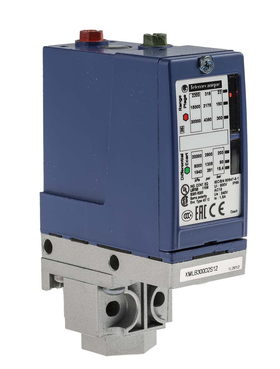 This is PRESSURE SWITCH A.D. 300B manufactured by Telemecanique Sensors. The manufacturer part number is XMLB300D2S12. Whereas, the minimum operating temperature of the product is -25°c. It also carries 3 a maximum current. It is IP rated with ip66. It has provided with screw clamp terminal electrical connection. Whereas, its maximum pressure reading is 300bar . The product also features robust zinc alloy housing material. In addition, it has a minimum 22bar pressure reading . Features 500 v supply voltage. It has a maximum operating temperature of +70°c. It is created for measuring medias like hydraulic oil . It provides high accuracy of <2 %.