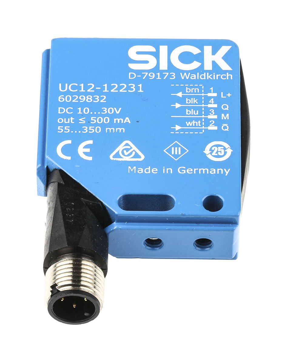 This is Ultrasonic Sensor Block 55 → 250 mm PNP 4-Pin M12 Connector IP67 manufactured by Sick. The manufacturer part number is UC12-12231. The no is the output function of the product. It exhibits a typical 25 hz switching frequency . The product also features robust die cast zinc housing material. Furthermore, the product is 43.5mm wide. Features 10 → 30 v dc supply voltage. It has a maximum 25hz switching frequency. Reverse Polarity Protection Options - yes. The product has 250 mm of detection range. It has a block body style. It has a maximum operating temperature of +70°c. It is IP rated with ip67. It is integrated with 500 ma switching current. Its accurate length is 50.5mm. It has 30v maximum DC voltage. It has a typical thread size of m4. Short Circuit Overload Protection Options - yes. The sensor utilises ultrasonic, a standard technology in sensor markets. The product comes in 15mm depth. Whereas, the minimum operating temperature of the product is -25°c. It allows m12 connection type.