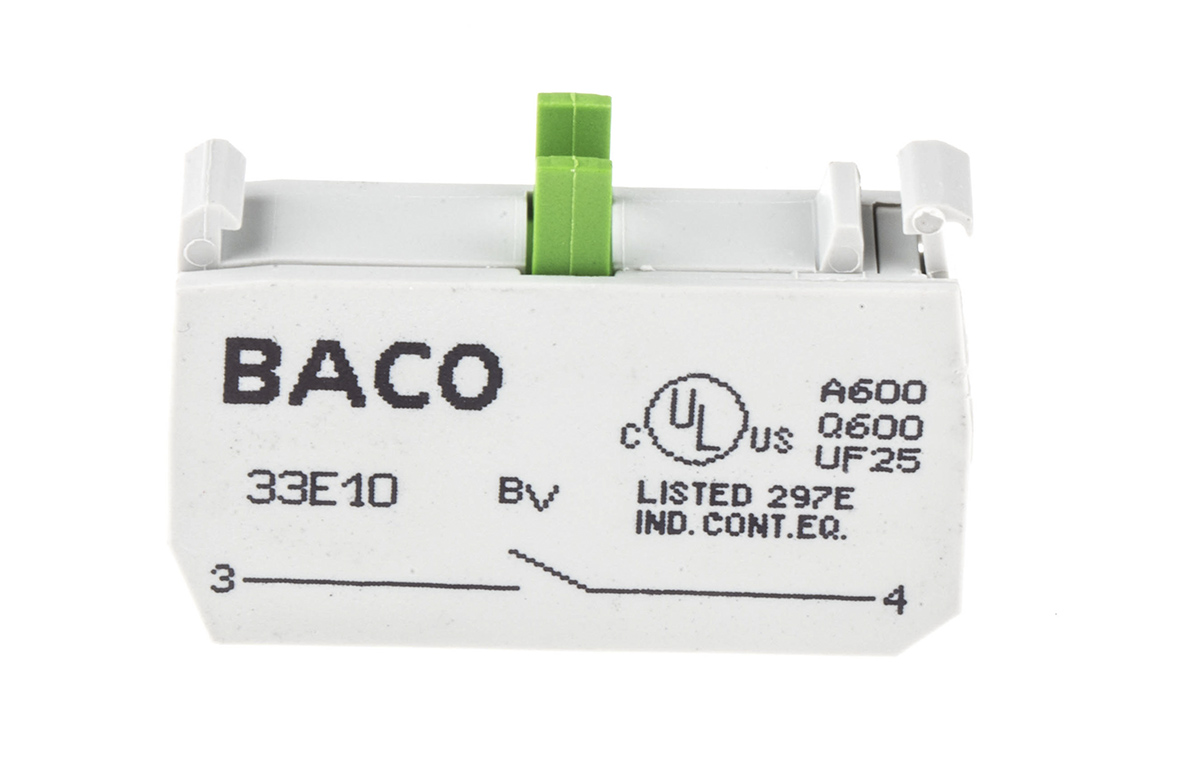This is Contact Block 1NO Screw terminal manufactured by BACO. The manufacturer part number is 33E10. The product has a current rating of 10a. Moreover, the product has a nominal 600v voltage rating. The product baco, is a highly preferred choice for users. It includes a body/fixing collar no . The contact is equipped with 1no configuration. Its block type is contact block . The terminal is a screw type.