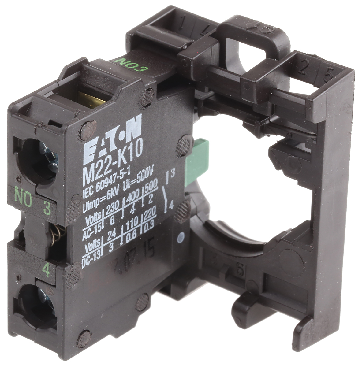 The Eaton M22 Contact Block (216504 M22-AK10) — is an essential component designed for reliability and versatility in various electrical applications. This contact block features one normally open (1NO) configuration, capable of handling up to 500V and 4A, ensuring efficient operation in demanding environments. Built with durable screw terminals, the M22 Contact Block offers straightforward installation and secure connections, making it a favoured choice among professionals. Its robust design guarantees longevity, while the compact form factor allows for seamless integration into control systems, machinery, and panel setups.