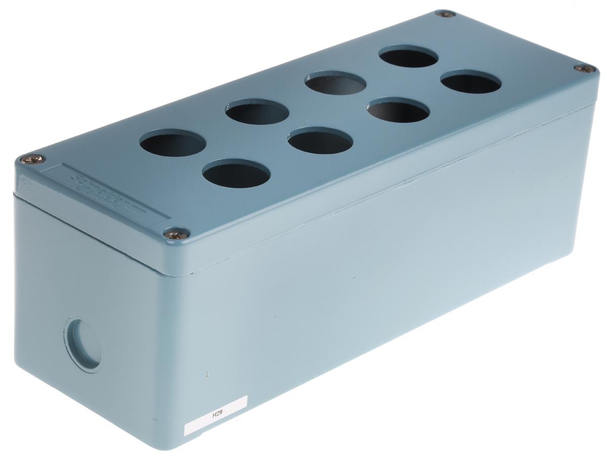 This is Harmony XAP Push Button Enclosure 8 Hole Blue 22mm diameter None Metal manufactured by Schneider Electric. The manufacturer part number is XAPM4508H29. The product harmony xap, is a highly preferred choice for users. Its accurate length is 220mm. It has a none enclosure marking . Furthermore, the product is 80mm wide. The product comes in 74.5mm depth. Additionally, it includes 8 cutouts . Its is offered with blue colour enclosure . Whereas its cut-out diameter is 22mm. It has a maximum operating temperature of +70°c. In addition, its enclosure is made up of metal material .