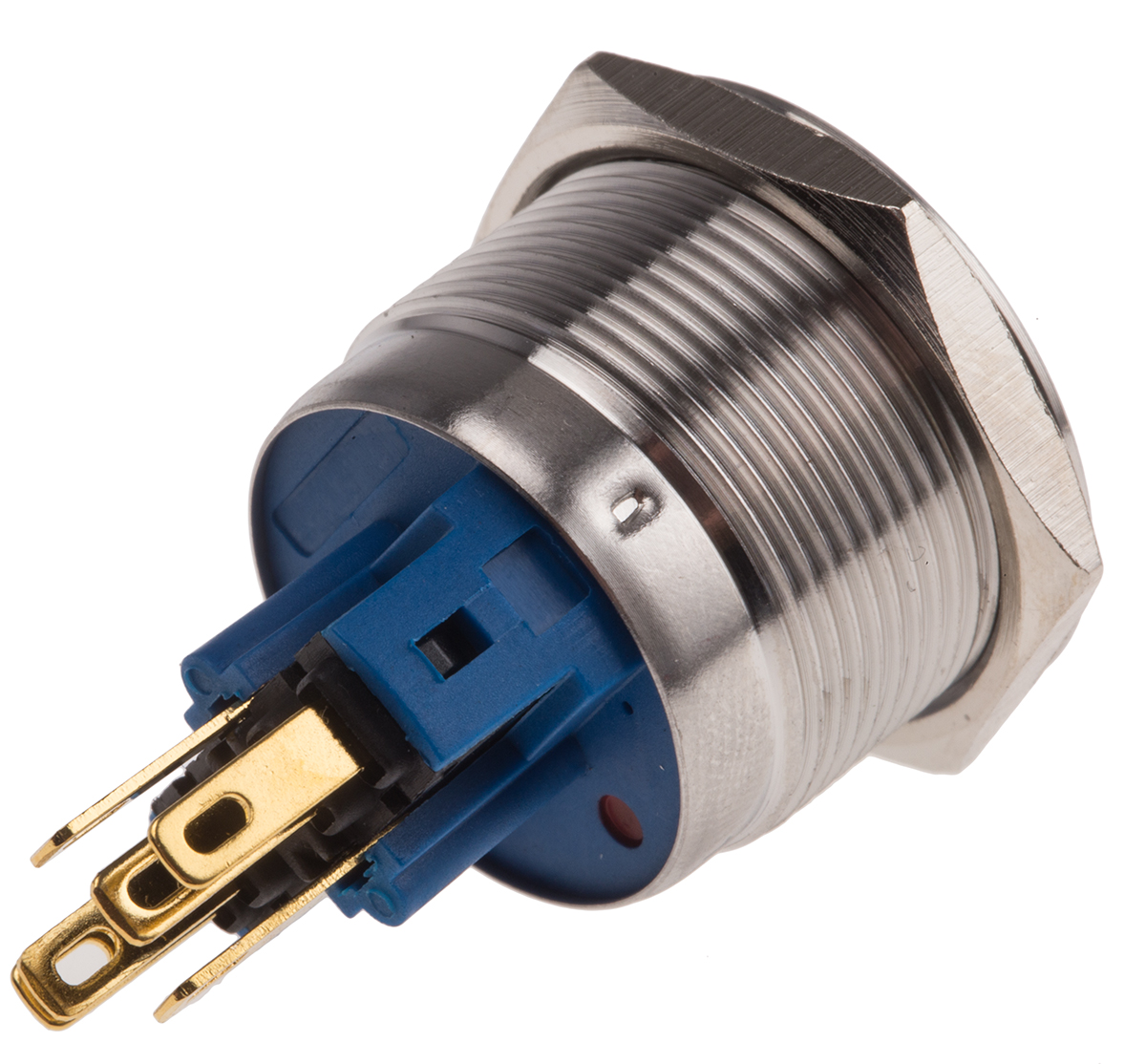 This is SPDT On-Momentary Push Button Switch IP65 IP67 22 (Dia.)mm Panel Mount Red LED 250V ac manufactured by RS Pro. The manufacturer part number is 811-8544. Illumination Option yes. The product is available in panel mount configuration. Moreover, the product has a nominal 250v ac voltage rating. The rated contact current is 5 a @ 250 v ac. The panel has a 22mm cut-out diameter. It is IP rated with ip65, ip67. This pushbutton has a round style pushbutton and is easy to use. The LED has an adorable red colour. While it has an adorable silver colour. The product has an assigned av02l-b12-m3-fr-r-12v manufacturer part number. It provides momentary switch operation. Its contact AC voltage rating is about 250v . The terminal is a quick connect type. The contact is equipped with spdt configuration. The product is made from sturdy silver alloy materials.