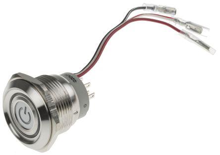 This is DPDT On-Momentary Push Button Switch IP67 (Above Panel) Panel Mount Blue Green Red LED Power Symbol LED 220V manufactured by RS Pro. The manufacturer part number is 877-1873. It is designed with an adorable flat shape actuator . The actuator has an adorable white colour. Illumination Option yes. The product is available in panel mount configuration. It is IP rated with ip67. The rated contact current is 5 a @ 250 v ac. The panel has a 30.2mm cut-out diameter. Moreover, the product has a nominal 220v voltage rating. The LED has an adorable blue, green, red colour. The product carries flat actuator. The terminal is a solder/quick connect type. The contact is equipped with double pole double throw (dpdt) configuration. Its contact AC voltage rating is about 250v . Legend Information: power symbol. It provides momentary switch operation.
