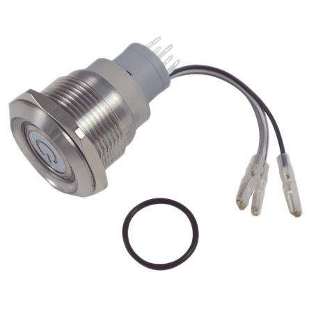 This is DPDT On-Momentary Push Button Switch IP67 (Above Panel) Panel Mount Blue Green Red LED Power Symbol 24V manufactured by RS Pro. The manufacturer part number is 877-1864. It is designed with an adorable flat shape actuator . The actuator has an adorable white colour. Illumination Option yes. The product is available in panel mount configuration. It is IP rated with ip67. The rated contact current is 5 a @ 250 v ac. The panel has a 30.2mm cut-out diameter. Moreover, the product has a nominal 24v voltage rating. The LED has an adorable blue, green, red colour. The product carries flat actuator. The terminal is a solder/quick connect type. The contact is equipped with double pole double throw (dpdt) configuration. Its contact AC voltage rating is about 250v . Legend Information: power symbol. It provides momentary switch operation.
