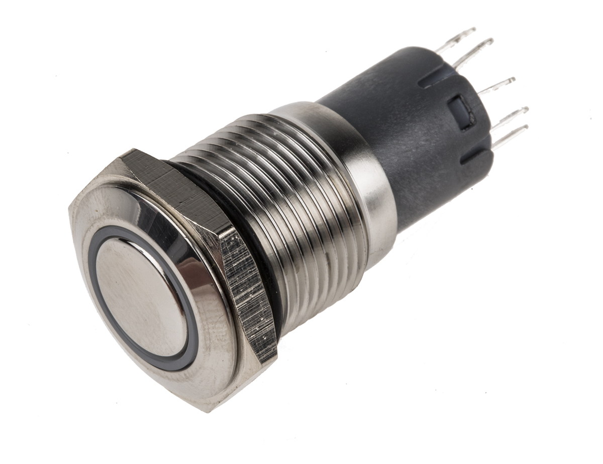 This is SPDT On-On Push Button Switch IP65 IP67 16 (Dia.)mm Panel Mount White LED 250V ac manufactured by RS Pro. The manufacturer part number is 811-8415. Illumination Option yes. The product is available in panel mount configuration. It is IP rated with ip65, ip67. The rated contact current is 3 a @ 250 v ac. The panel has a 16mm cut-out diameter. Moreover, the product has a nominal 250v ac voltage rating. This pushbutton has a round style pushbutton and is easy to use. The LED has an adorable white colour. While it has an adorable silver colour. The contact is equipped with spdt configuration. The product has an assigned av03l-b32-m3-fr-w-12v manufacturer part number. It provides latching switch operation. Its contact AC voltage rating is about 250v . The terminal is a solder type. The product is made from sturdy sliver alloy materials.