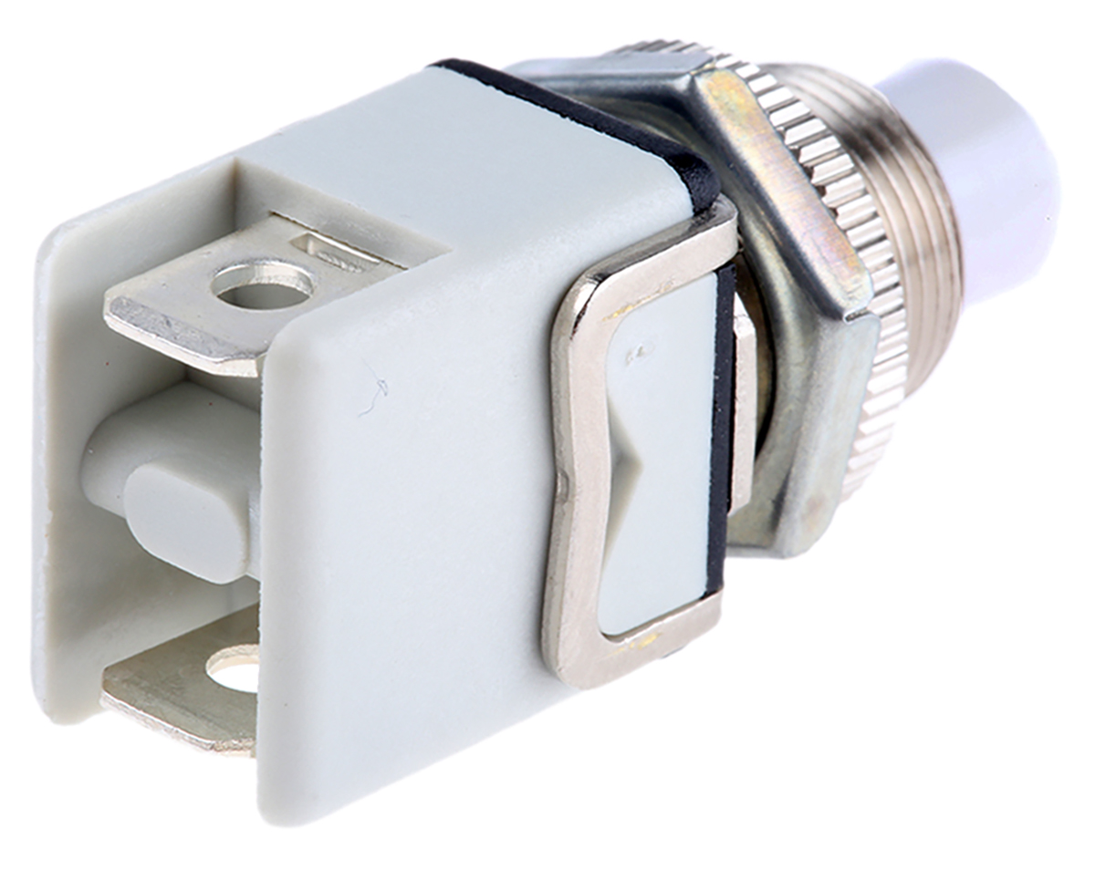 This is SP-NC Momentary Push Button Switch Panel Mount manufactured by APEM. The manufacturer part number is 1212C WHITE. Illumination Option no. The product is available in panel mount configuration. Moreover, the product has a nominal 250v ac voltage rating. The rated contact current is 2 a @ 24 v dc. The panel has a 12.2mm cut-out diameter. The contact is equipped with spst configuration. The product has an assigned 1212c white manufacturer part number. It provides momentary switch operation. While it has an adorable white colour. The terminal is a solder, tab type. The product is made from sturdy silver plated copper materials.