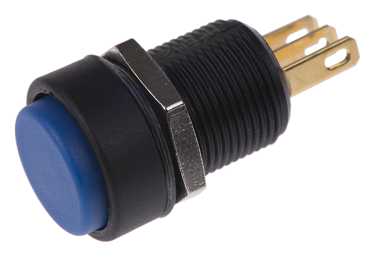 This is NO/NC Momentary Push Button Switch IP67 Panel Mount manufactured by Apem. The manufacturer part number is IMP7Z4B2234UL. Illumination Option no. The product is available in panel mount configuration. It is IP rated with ip67. The rated contact current is 3 a. The panel has a 13.6mm cut-out diameter. Moreover, the product has a nominal 28v dc voltage rating. The contact is equipped with spdt configuration. The casing is finished with an adorable black colour. While it has an adorable blue colour. The product has an assigned imp7z4b2234ul manufacturer part number. It provides momentary switch operation. The terminal is a quick connect type. The product is made from sturdy gold plated silver materials.