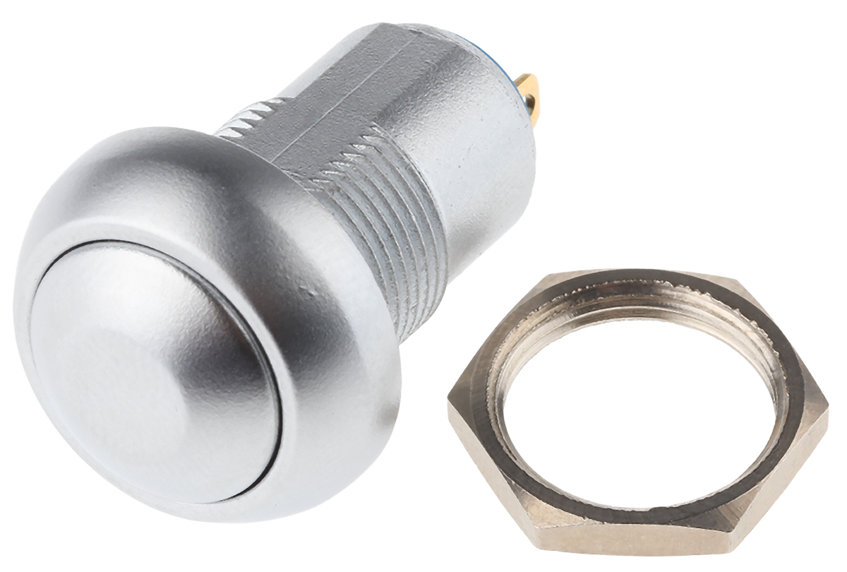 This is SP-NO Off-On Push Button Switch IP67 Panel Mount manufactured by APEM. The manufacturer part number is IPR1SAD0105. Illumination Option no. The product is available in panel mount configuration. Moreover, the product has a nominal 24v dc voltage rating. The rated contact current is 5 a @ 28 v dc. The panel has a 12.9mm cut-out diameter. It is IP rated with ip67. This pushbutton has a dome style pushbutton and is easy to use. The contact is equipped with spst configuration. While it has an adorable silver colour. The product has an assigned ipr1sad0105 manufacturer part number. It provides latching switch operation. The terminal is a solder type. The product is made from sturdy gold plated silver materials.