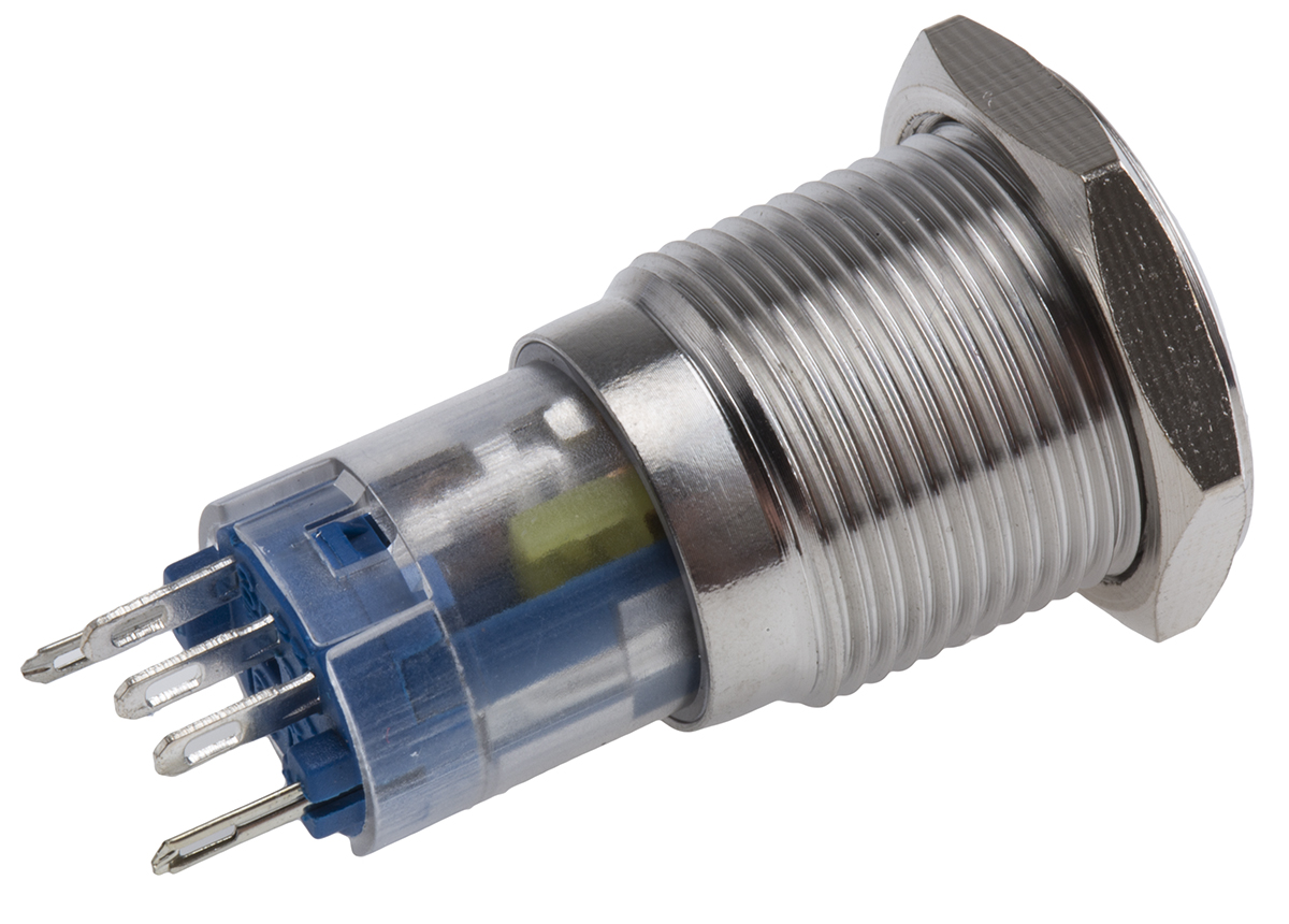 This is SPDT On-Momentary Push Button Switch IP65 IP67 16 (Dia.)mm Panel Mount Red LED 250V ac manufactured by RS Pro. The manufacturer part number is 811-8455. Illumination Option yes. The product is available in panel mount configuration. It is IP rated with ip65, ip67. The rated contact current is 3 a @ 250 v ac. The panel has a 16mm cut-out diameter. Moreover, the product has a nominal 250v ac voltage rating. This pushbutton has a round style pushbutton and is easy to use. The LED has an adorable red colour. While it has an adorable silver colour. The contact is equipped with spdt configuration. The product has an assigned av02l-b32-m3-fr-r-24v manufacturer part number. It provides momentary switch operation. Its contact AC voltage rating is about 250v . The terminal is a solder type. The product is made from sturdy sliver alloy materials.
