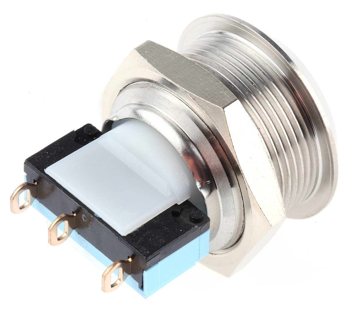 This is SPDT-NO/NC Momentary Push Button Switch IP65 manufactured by Apem. The manufacturer part number is AV22LC432. Illumination Option no. The product is available in panel mount configuration. Moreover, the product has a nominal 250v ac voltage rating. The rated contact current is 5 a @ 250 v ac. The panel has a 19.2mm cut-out diameter. It is IP rated with ip65. This pushbutton has a round style pushbutton and is easy to use. The contact is equipped with spdt configuration. While it has an adorable green colour. The product has an assigned av22lc432 manufacturer part number. It provides momentary switch operation. The terminal is a solder type. The product is made from sturdy silver; nickel alloy materials.