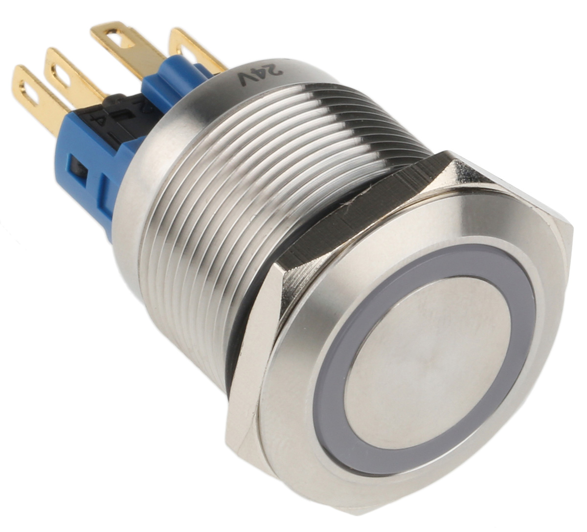 This is SPDT On-On Push Button Switch IP65 IP67 22 (Dia.)mm Panel Mount Blue LED 24V manufactured by RS Pro. The manufacturer part number is 811-8496. Illumination Option yes. The product is available in panel mount configuration. It is IP rated with ip65, ip67. The rated contact current is 5 a @ 250 v ac. The panel has a 22mm cut-out diameter. Moreover, the product has a nominal 24v voltage rating. This pushbutton has a round style pushbutton and is easy to use. The LED has an adorable blue colour. While it has an adorable silver colour. The contact is equipped with spdt configuration. The product has an assigned av03l-b12-m3-fr-b-24v manufacturer part number. It provides latching switch operation. Its contact AC voltage rating is about 250v . The terminal is a quick connect type. The product is made from sturdy silver alloy materials.