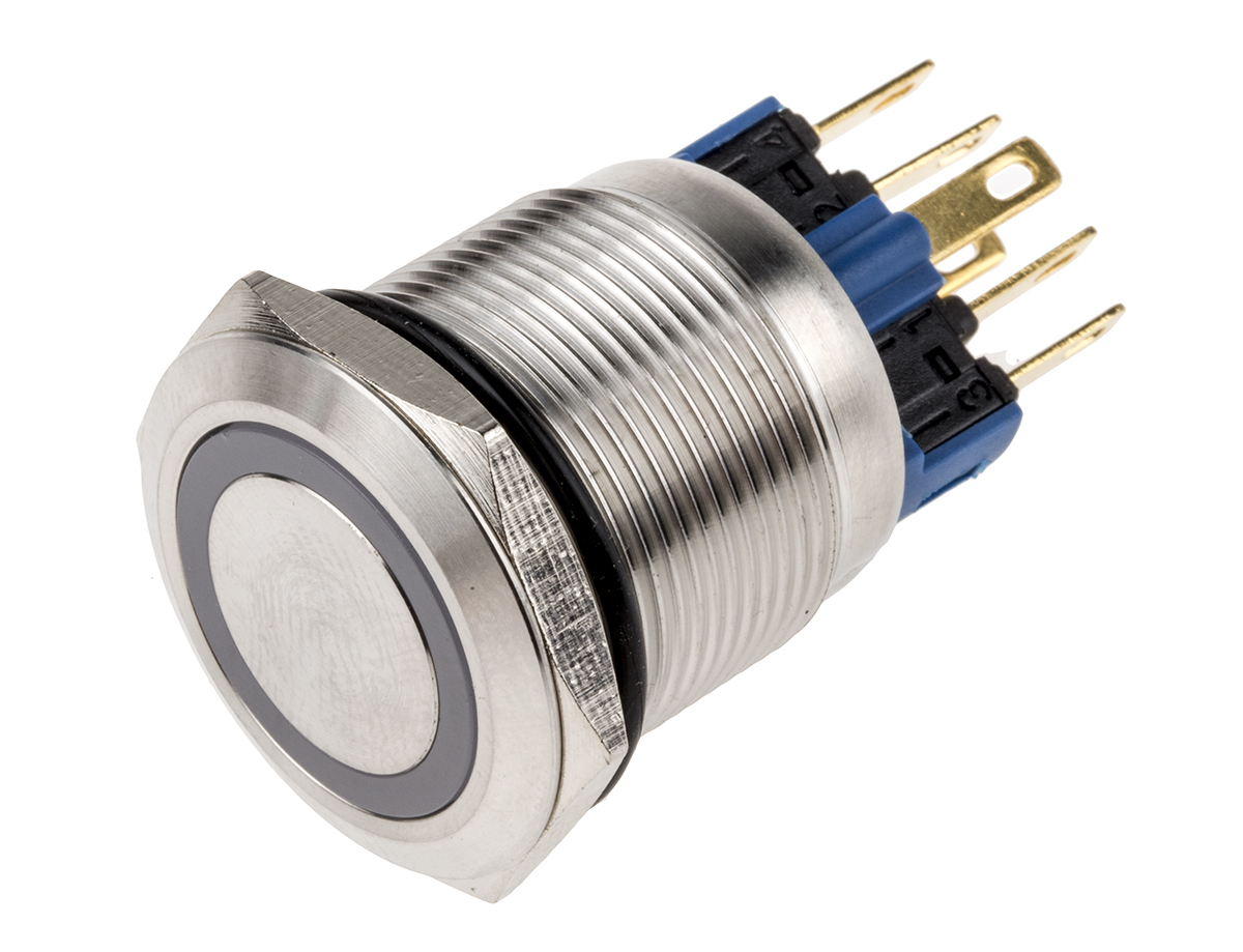 This is SPDT On-On Push Button Switch IP65 IP67 22 (Dia.)mm Panel Mount White LED 250V ac manufactured by RS Pro. The manufacturer part number is 811-8516. Illumination Option yes. The product is available in panel mount configuration. Moreover, the product has a nominal 250v ac voltage rating. The rated contact current is 5 a @ 250 v ac. The panel has a 22mm cut-out diameter. It is IP rated with ip65, ip67. This pushbutton has a round style pushbutton and is easy to use. The LED has an adorable white colour. While it has an adorable silver colour. The product has an assigned av03l-b12-m3-fr-w-230v manufacturer part number. It provides latching switch operation. Its contact AC voltage rating is about 250v . The terminal is a quick connect type. The contact is equipped with spdt configuration. The product is made from sturdy silver alloy materials.