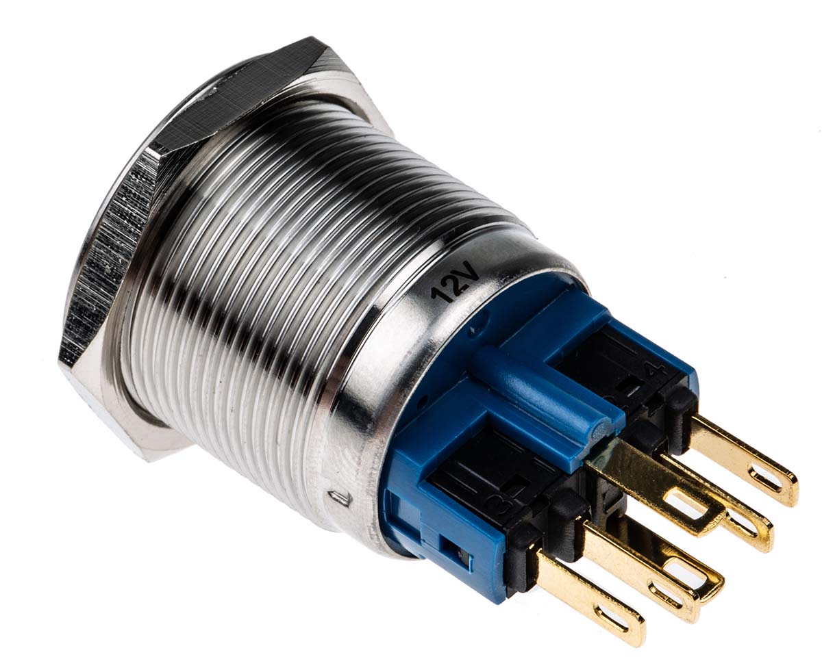 This is SPDT On-On Push Button Switch IP65 IP67 22 (Dia.)mm Panel Mount Blue LED 12V manufactured by RS Pro. The manufacturer part number is 811-8483. Illumination Option yes. The product is available in panel mount configuration. It is IP rated with ip65, ip67. The rated contact current is 5 a @ 250 v ac. The panel has a 22mm cut-out diameter. Moreover, the product has a nominal 12v voltage rating. This pushbutton has a round style pushbutton and is easy to use. The LED has an adorable blue colour. While it has an adorable silver colour. The contact is equipped with spdt configuration. The product has an assigned av03l-b12-m3-fr-b-12v manufacturer part number. It provides latching switch operation. Its contact AC voltage rating is about 250v . The terminal is a quick connect type. The product is made from sturdy silver alloy materials.