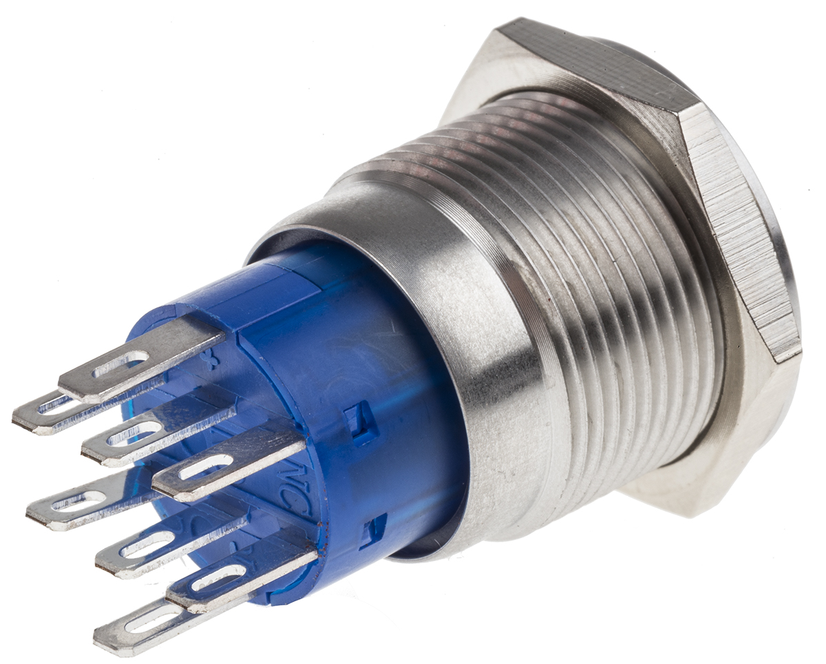 This is DPDT Momentary Push Button Switch IP67 19.2 (Dia.)mm Panel Mount Red LED 250V ac manufactured by RS Pro. The manufacturer part number is 111-3768. Illumination Option yes. The product is available in panel mount configuration. It is IP rated with ip67. The rated contact current is 5 a. The panel has a 19.2mm cut-out diameter. Moreover, the product has a nominal 250v ac voltage rating. This pushbutton has a round style pushbutton and is easy to use. The LED has an adorable red colour. The casing is finished with an adorable natural colour. While it has an adorable silver colour. The contact is equipped with dpdt configuration. The product has an assigned mpb19-a0f20e-324-jq manufacturer part number. It provides momentary switch operation. Its contact AC voltage rating is about 250v . The terminal is a solder pin type. The product is made from sturdy copper materials.