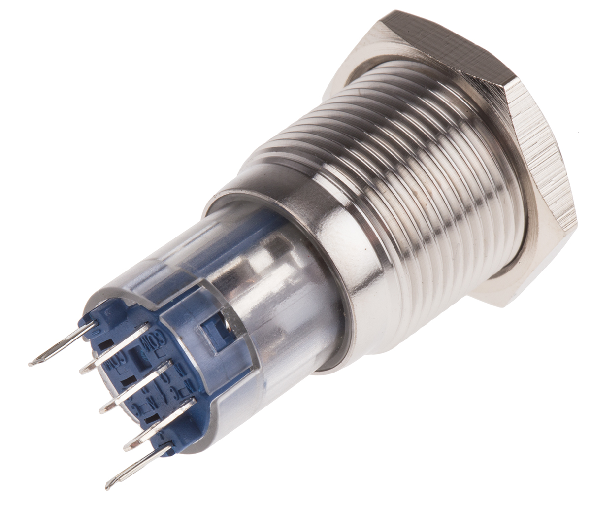 This is SPDT On-On Push Button Switch IP65 IP67 16 (Dia.)mm Panel Mount Blue LED 250V ac manufactured by RS Pro. The manufacturer part number is 811-8386. Illumination Option yes. The product is available in panel mount configuration. It is IP rated with ip65, ip67. The rated contact current is 3 a @ 250 v ac. The panel has a 16mm cut-out diameter. Moreover, the product has a nominal 250v ac voltage rating. This pushbutton has a round style pushbutton and is easy to use. The LED has an adorable blue colour. While it has an adorable silver colour. The contact is equipped with spdt configuration. The product has an assigned av03l-b32-m3-fr-b-12v manufacturer part number. It provides latching switch operation. Its contact AC voltage rating is about 250v . The terminal is a quick connect type. The product is made from sturdy sliver alloy materials.