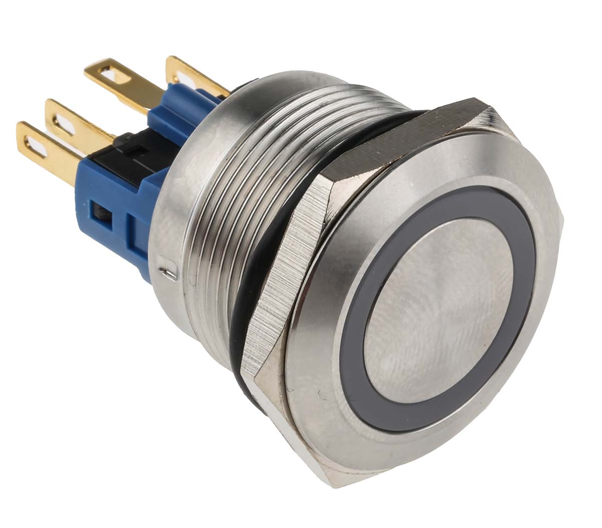 This is SPDT On-Momentary Push Button Switch IP65 IP67 22 (Dia.)mm Panel Mount Blue LED 250V ac manufactured by RS Pro. The manufacturer part number is 811-8538. Illumination Option yes. The product is available in panel mount configuration. Moreover, the product has a nominal 250v ac voltage rating. The rated contact current is 5 a @ 250 v ac. The panel has a 22mm cut-out diameter. It is IP rated with ip65, ip67. This pushbutton has a round style pushbutton and is easy to use. The LED has an adorable blue colour. While it has an adorable silver colour. The product has an assigned av02l-b12-m3-fr-b-24v manufacturer part number. It provides momentary switch operation. Its contact AC voltage rating is about 250v . The terminal is a quick connect type. The contact is equipped with spdt configuration. The product is made from sturdy silver alloy materials.