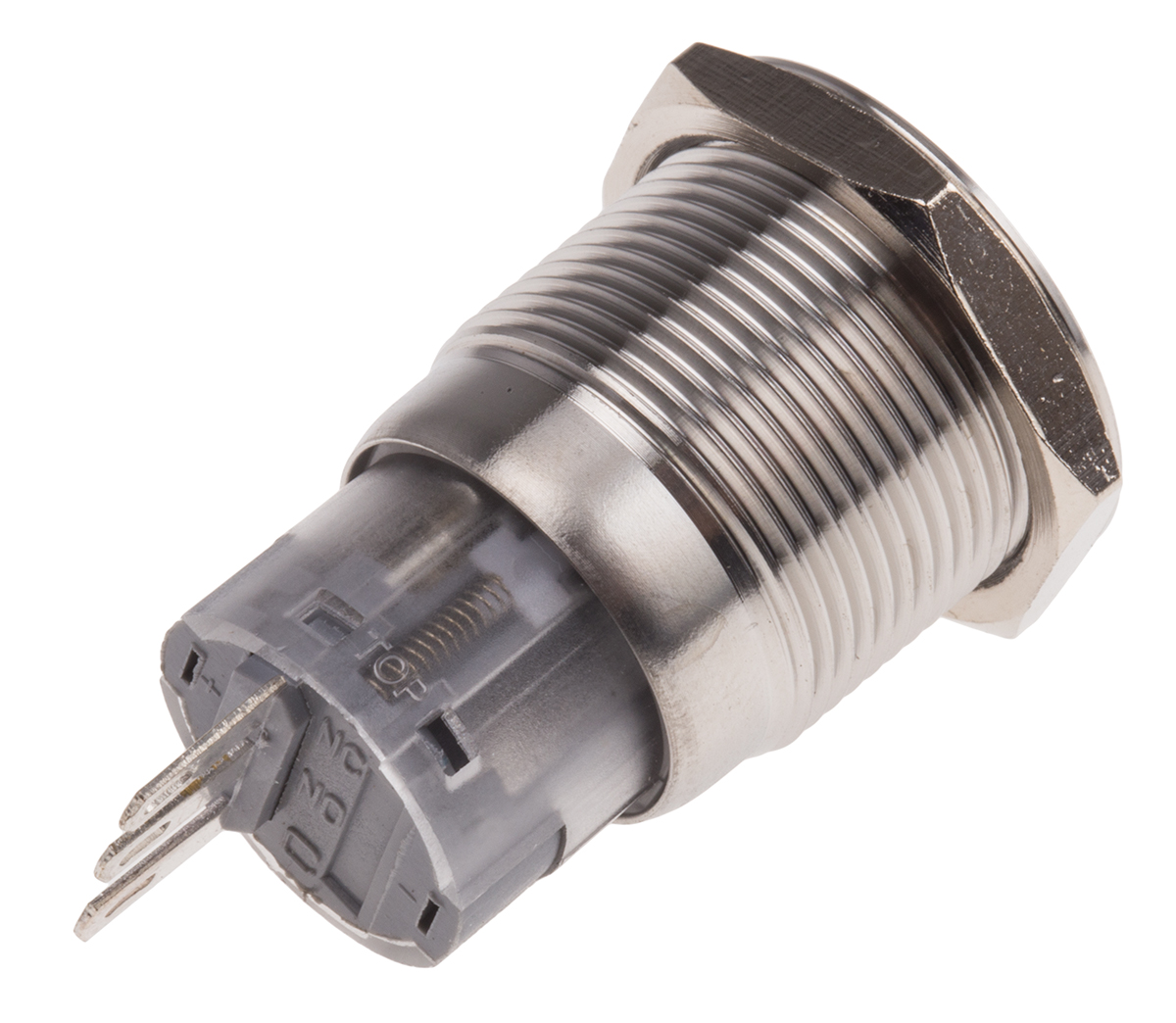 This is SPDT On-On Push Button Switch IP65 IP67 19 (Dia.)mm Panel Mount 250V ac manufactured by RS Pro. The manufacturer part number is 811-8575. Illumination Option no. The product is available in panel mount configuration. Moreover, the product has a nominal 250v ac voltage rating. The rated contact current is 5 a @ 250 v ac. The panel has a 19mm cut-out diameter. It is IP rated with ip65, ip67. This pushbutton has a round style pushbutton and is easy to use. The contact is equipped with spdt configuration. While it has an adorable chrome colour. It provides latching switch operation. Its contact AC voltage rating is about 250v . The terminal is a quick connect type. The product is made from sturdy sliver alloy materials.
