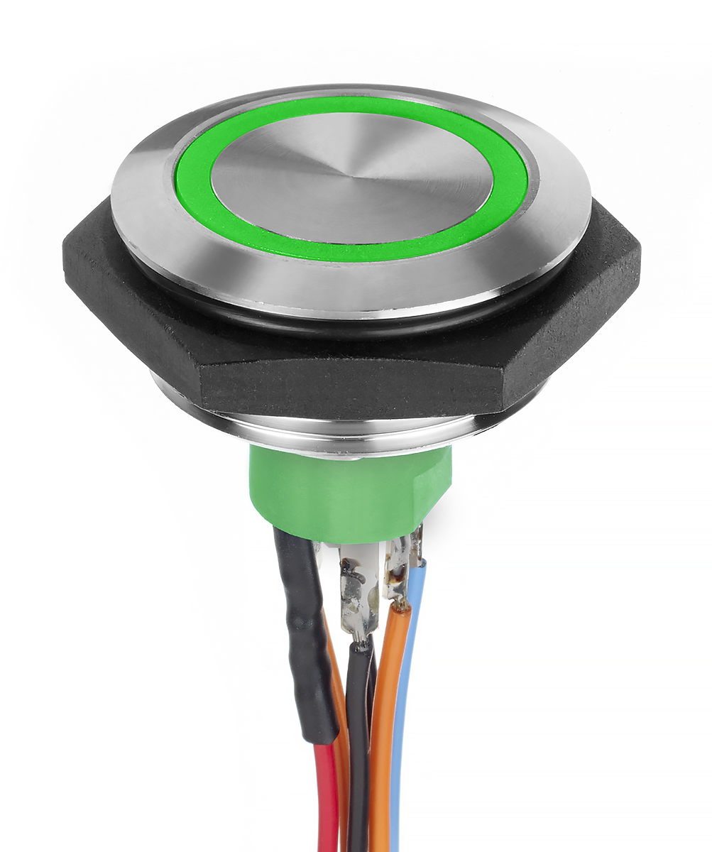 This is SPST Momentary Push Button Light Switch IP67 30.2 (Dia.)mm Panel Mount Green LED 30V dc manufactured by APEM. The manufacturer part number is AV5V022000074BK. Illumination Option yes. The product is available in panel mount configuration. It is IP rated with ip67. The rated contact current is 1 a. The panel has a 30.2mm cut-out diameter. Moreover, the product has a nominal 30v dc voltage rating. It has about 30v contact DC voltage rating . This pushbutton has a round style pushbutton and is easy to use. The LED has an adorable green colour. While it has an adorable silver colour. The contact is equipped with spst configuration. The product has an assigned av5v022000074bk manufacturer part number. It provides momentary switch operation. The terminal is a solder/quick connect type. The product is made from sturdy silver materials.