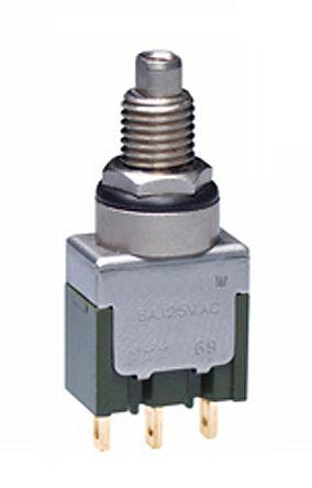 This is SPDT On-Momentary On Push Button Switch Bushing 28V ac/dc manufactured by NKK Switches. The manufacturer part number is MB2011SD8G01. It is designed with an adorable round shape actuator . Illumination Option no. The product is available in bushing configuration. Moreover, the product has a nominal 28v ac/dc voltage rating. The rated contact current is 100 ma. It has about 28v contact DC voltage rating . The contact is equipped with single pole double throw (spdt) configuration. The casing is finished with an adorable black colour. The product carries plunger actuator. Its contact AC voltage rating is about 28v . The terminal is a solder lug type. It provides momentary switch operation.