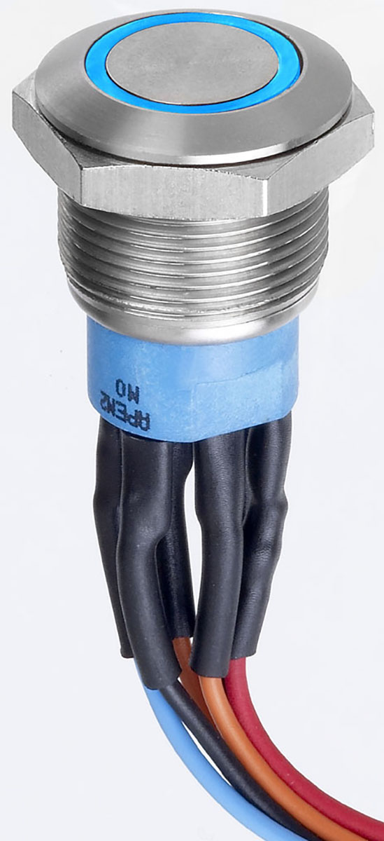 This is NO/NC Momentary Push Button Switch IP67 Panel Mount Blue LED manufactured by Apem. The manufacturer part number is AV9112F1020840K. Illumination Option yes. The product is available in panel mount configuration. It is IP rated with ip67. The rated contact current is 1 a @ 30 v dc. The panel has a 19.2mm cut-out diameter. Moreover, the product has a nominal 30v dc voltage rating. This pushbutton has a round style pushbutton and is easy to use. The LED has an adorable blue colour. While it has an adorable silver colour. The contact is equipped with spdt configuration. The product has an assigned av9112f1020840k manufacturer part number. It provides momentary switch operation. The terminal is a flying lead type. The product is made from sturdy silver materials.